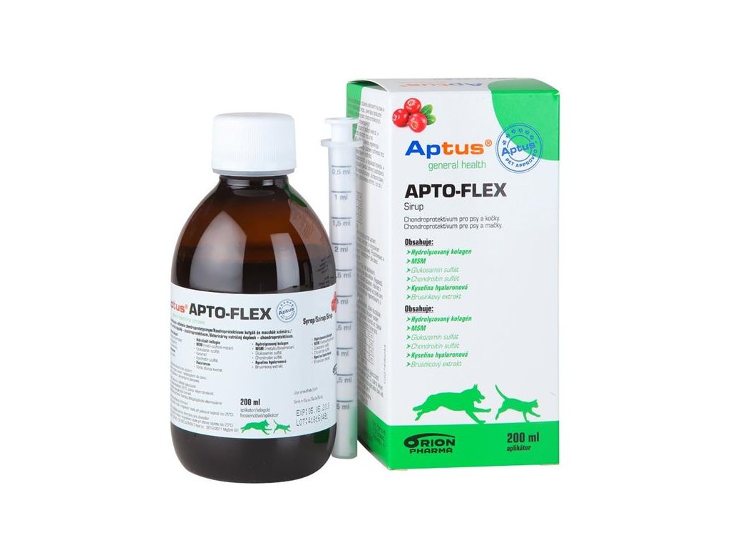 Aptus APTO-FLEX VET sirup je unikátní pětisložkové solubilní chondroprotektivum s kyselinou hyaluronovou a antioxidanty pro psy a kočky.