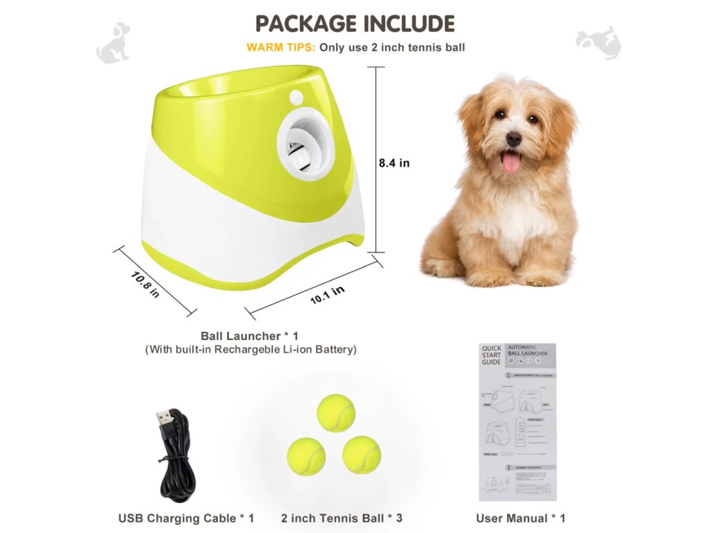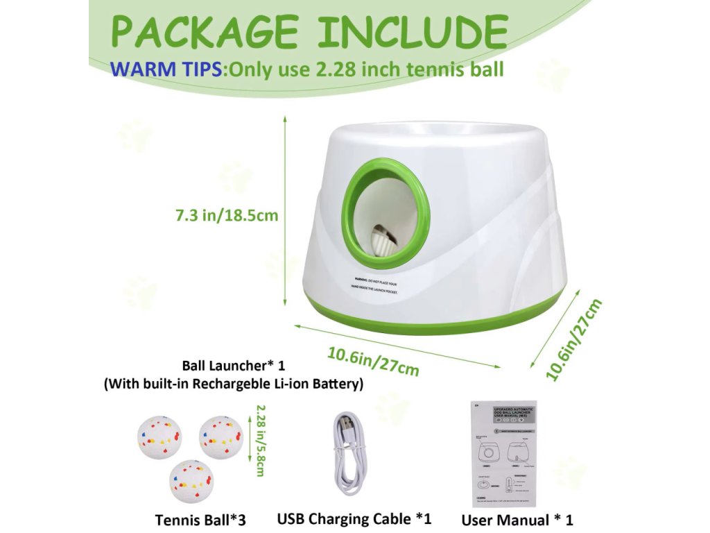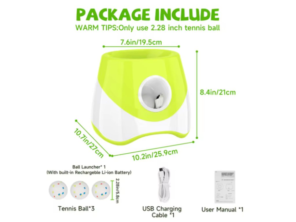 Součástí balení jsou 3 tenisové míčky o průměru 58 mm, které jsou speciálně přizpůsobeny pro tento vrhač. Stačí zapnout zařízení, vložit míček a hra může začít. Díky praktickému přenosnému designu lze vrhač snadno přemístit a vzít s sebou na výlet nebo dovolenou.