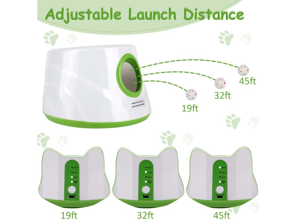 Zařízení nabízí 3 nastavitelné vzdálenosti odpalu – přibližně 6 m, 10 m a 14 m, takže můžete snadno přizpůsobit hru prostoru i velikosti psa. 🎾 V menších místnostech zvolíte kratší vzdálenost, zatímco venku na zahradě nebo v parku využijete maximální dosah. Díky tomu je vrhač vhodný pro malé i středně velké psy, kteří milují aportování.