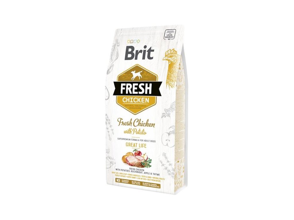 Čerstvé kuřecí maso s bramborem, pohankou, jablkem a tymiánem. Superprémiová receptura pro dospělé psy. Holistické krmivo vyrobené šetrnou metodou s použitím 40 % čerstvého masa. Kompletní krmivo pro psy. „Při přípravě Brit Fresh granulí jsme použili čerstvé maso a vynechali tak jeden krok jeho zpracování. Zachovali jsme tak přirozené výživové, a především chuťové vlastnosti masa a jeho vůni. Spolu s přílohami z původních zrnin jako je pohanka, proso či oves, tradiční byliny, dýně, cuketa a ovoce jsme vytvořili zdravé a delikátní menu. A to rozhodně potěší každého psího milovníka chuťově skvělé a zdravé výživy na vysoké úrovni.“ pro skvělý život dospělých psů lepší chuť a čerstvá vůně, lepší dlouhodobá chutnost obsahuje původní zrniny a staré kulturní plodiny – brambory, oves, pohanka, lněné semínko, černý rybíz tradiční byliny – tymián, rozmarýn, měsíček lékařský, pampeliška, petržel bez lepku – bez sóji – bez kukuřice – bez barviv a chemických dochucovadel.