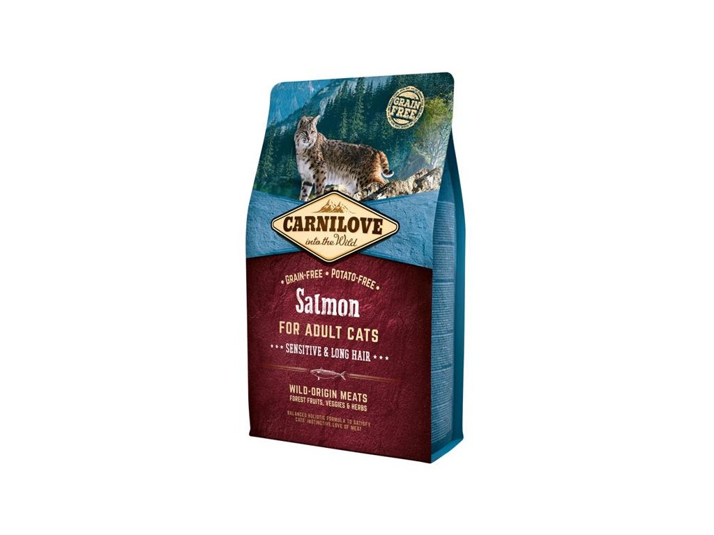 Carnilove Salmon for Adult Cats Sensitive & Long Hair- holistické krmivo pro dospělé kočky s citlivým zažíváním a pro dlouhosrsté kočky. Kompletní krmivo pro kočky. Dospělé kočky potřebují pro udržení kondice potravu bohatou na kvalitní bílkoviny s dostatečným a vyváženým obsahem potřebných aminokyselin. Carnilove Salmon for Adult Cats je navržen s respektem k přirozené skladbě potravy koček. Maso a tuk z lososa jsou ideálním zdrojem omega-3 nenasycených mastných kyselin, které působí protizánětlivě a pozitivně ovlivňují kvalitu srsti a kůže. Losos navíc patří mezi nealergenní proteiny a je tedy ideálním zdrojem potravy pro kočky s citlivým trávením. V kombinaci s lesním ovocem, zeleninou a bylinami poskytuje tato receptura každodenně potřebné živiny, vitaminy, minerály a antioxidanty pro perfektní kondici a formování přirozené imunity.