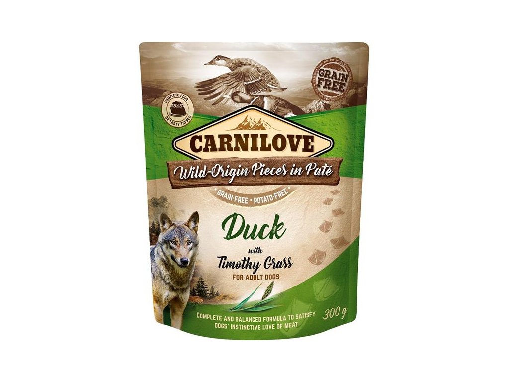 Psí kapsička Carnilove neobsahuje žádné obiloviny ani brambory. Receptura Duck je bohatá na maso z kachny a je doplněna o bojínek luční. Kachní filety jsou naloženy v paštice. Jedná se o kompletní krmivo pro psy. Kapsičky pro psy Carnilove Dog Pouch Paté lze zakoupit v 9 lahodných příchutích. bez obilovin a brambor bez GMO, sóji, konzervantů a barviv bohaté na maso – 85 % kousků masa divokého původu ve filetech doplněné o lesní a luční byliny, zeleninu a lesní plody možnost využívat jako kompletní krmivo nebo jako chutný topping ke granulím