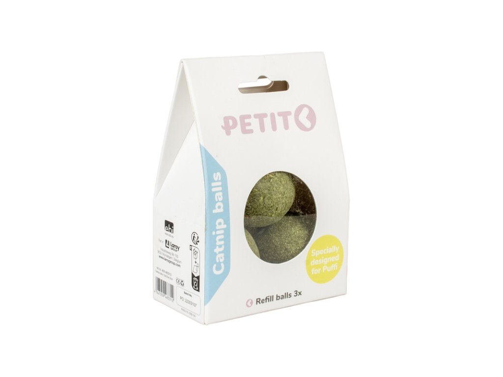 Balení 3 kuliček z lisovaného catnipu pro kočky. Kuličky lze použít samostatně nebo jako náplň do hračky Petit Puffi. Catnip (šanta kočičí) je přírodní nenávyková bylina, jejíž vůně přitahuje až 70 % koček.