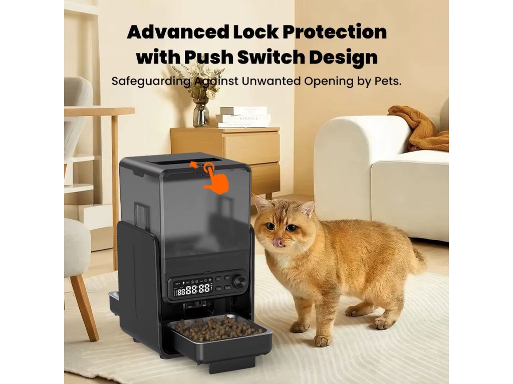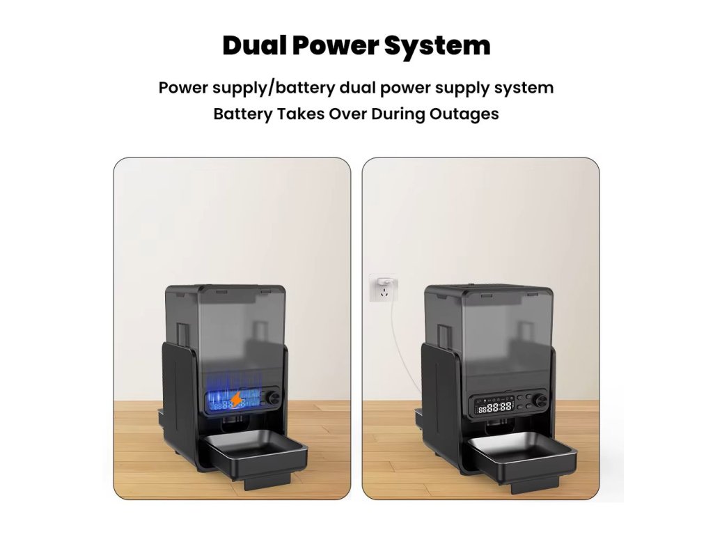 Chytrý dávkovač krmiva, který se postará o pravidelné a automatické krmení vašeho domácího mazlíčka. Je vybaven 5L velkou nádobou na granulky, která poskytne jídlo na více dnů. Pomocí tlačítek naplánujete časy krmení a počet jídel za den - panel je odnímatelný, pro pohodlné nastavení režimu. Zařízení je možno napájet pomocí kabelu nebo bateriemi (nejsou součástí balení). V případě výpadku proudu se dávkovač automaticky přepne do nouzového (baterie) režimu. Misky jsou vyrobeny z nerezové oceli, díky tomu se budou pohodlně čistit a nebudou podléhat korozi. Vybírejte ze dvou variant dávkovače - s wifi připojením, nebo jen s manuálním ovládacím panelem.