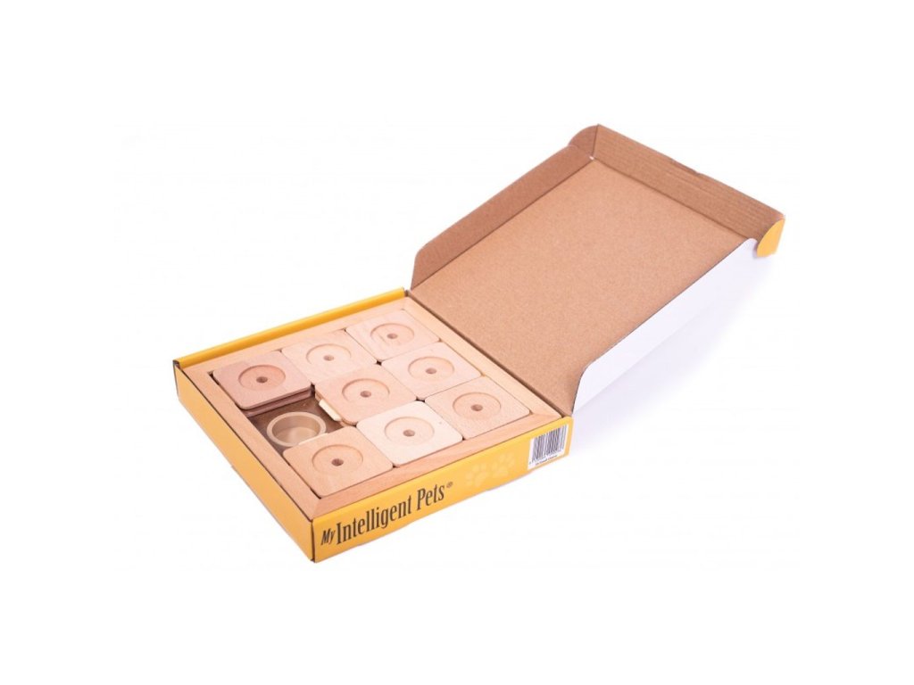 - Vzhledem k vysokému stupni obtížnosti buďte trpěliví a pokud se pejskovi samotnému nedaří, s hlavolamem mu pomáhejte, aby ho neřešil zbrkle a nebyl frustrován neúspěchem.
