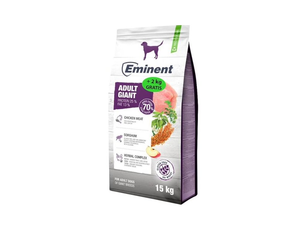 Kompletní krmivo Eminent Adult Giant je určené pro dospělé psy velkých a obřích plemen s hmotností nad 45 kg. Extra velké granule zabraňují hltání a zlepšují trávicí proces. Kousání velkých granulí pomáhá redukovat zubní kámen a udržovat ústní hygienu. Chondroitin s glukosaminem doplněné o mangan posilují klouby a chrupavky pro aktivní psí život bez bolesti. Prebiotika a vitamíny podporují rovnováhu střevní mikroflóry a posilují imunitní systém, zatímco omega mastné kyseliny dodávají lesk srsti a zdraví kůži.
