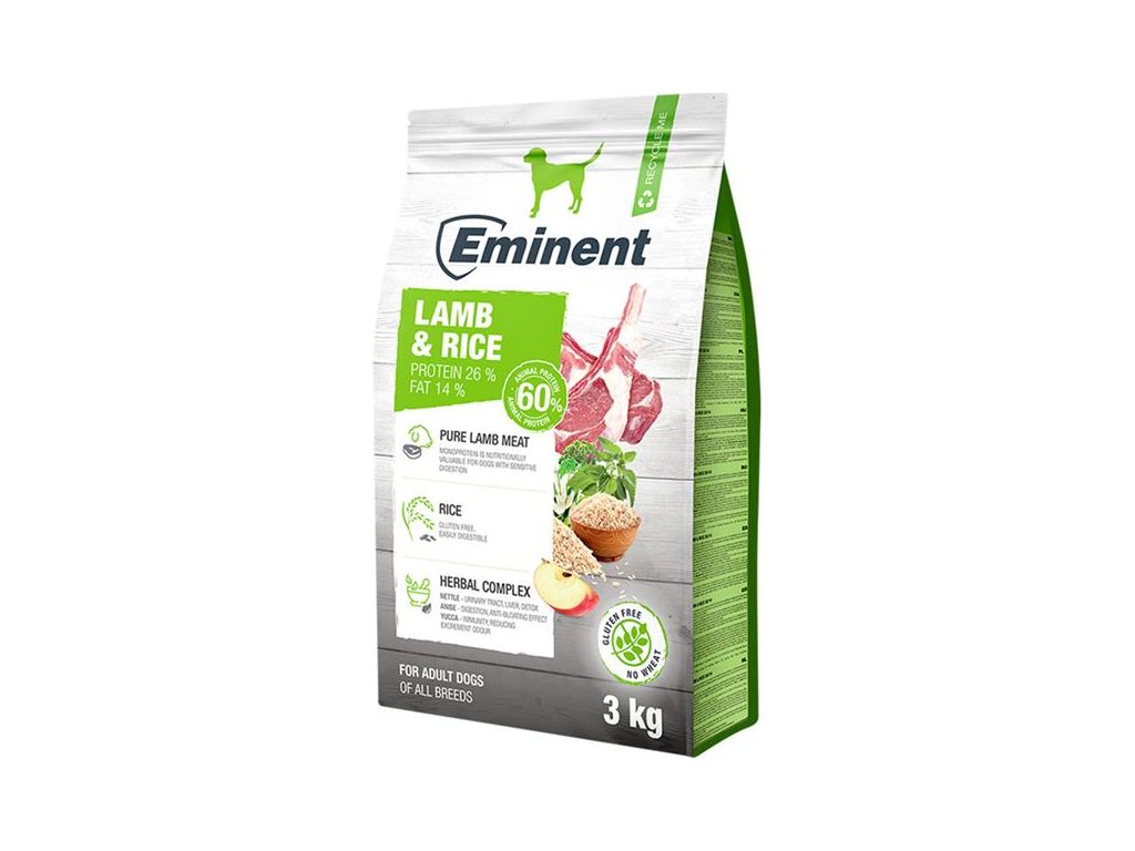 Řada psů má citlivé zažívání, trpí potravinovými alergiemi nebo kožními problémy. Krmivo s obsahem jehněčího masa a rýže je vytvořené s ohledem na hypoalergenní výživu. Krmivo je monoproteinové, aby minimalizovalo riziko vzniku alergií či intolerancí při jeho použití. Beta-glukany, MOS a FOS posilují imunitní systém a podporují zdraví trávicího traktu. Obsahuje minimálně 60 % proteinů živočišného původu. 220 g jehněčí moučky v 1 kg krmiva odpovídá 820 g čerstvého masa. Protein 26 % / Tuk 14 % Obsažené ingredience: čistě jehněčí maso – monoproteinová složení pro psy s citlivým zažíváním rýže – gluten free a snadno stravitelná chondroprotektiva – přídavky chondroitinu a glukosaminu napomáhají dobrému vývoji a regeneraci pohybového aparátu. Chelát manganu zajišťuje výživu chrupavky a omega – 3 mastné kyseliny působí preventivně proti zánětu kloubů. bylinný komplex – krmiva Eminent jsou obohacena o speciální bylinný komplex pro bezproblémové fungování organismu (kopřiva, anýz, Yucca schidigera) prebiotika MOS &FOS pro optimální trávení a posílení imunitního systému jablka – pro neuvěřitelný zdroj vitamínů, minerálů a vlákniny lněné semínko – výborný zdroj cenných nenasycených mastných kyselin a selenu hrách – pro bohatý zdroj bílkovin, tuků a uhlohydrátů