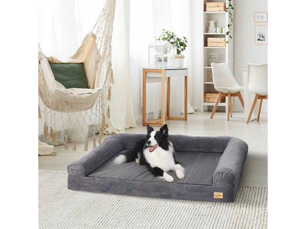 Pohodlný a stabilní pelíšek pro velké psy poskytuje pevnou oporu díky silné základně z houbovité pěny, která se neproleží a chrání psa před chladem od podlahy. Ergonomická konstrukce pomáhá ulevit páteři a kloubům a vytváří ideální místo pro kvalitní odpočinek. Tři zvýšené okraje vyplněné PP bavlnou si dlouhodobě drží tvar a dávají psovi pocit bezpečí. Ultra měkký PV plyš a jemná fleecová tkanina jsou příjemné na dotek, bezpečné a bez škodlivých látek. Pelíšek má snímatelný potah na zip, který lze prát v ruce i v pračce. Voděodolná vnitřní vložka chrání pěnu před nehodami a protiskluzová spodní strana z 600D Oxford tkaniny zabraňuje posouvání po podlaze. Vhodný i pro opravdu velké psy.