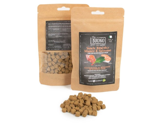 Farm Company PIU BUONO pamlsky pro psy s vepřovým a lososem 90 g (kůže a srst)