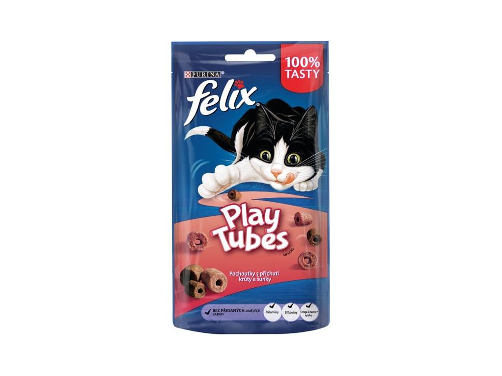 FELIX® Play Tubes jsou chutnou příležitostí, jak spolu sdílet zábavné chvilky! Jsou neodolatelně hravé díky unikátnímu kulatému tvaru, dvěma různým příchutím, různým velikostem a chuti FELIX® pochoutek, které vaše kočka zná a miluje. Jednoduše vezměte pochoutku, hoďte ji nebo kutálejte po podlaze a dívejte se, jak s ní začne vaše kočka rozpustile dovádět! Složení: maso a výrobky živočišného původu, obiloviny, oleje a tuky, bílkovinné extrakty rostlinného původu, minerální látky, cukry, kvasnice. Krmný návod: Denní krmná dávka pro dospělou kočku 4 kg: 14 g nebo přibližně 23 kousků. Čistá čerstvá pitná voda by měla být vždy k dispozici. Pro zdraví vaší kočky dodržujte krmný návod a patřičně upravte dávku běžně podávaného krmiva. Dohlížejte na svou kočku během podávání pochoutky.