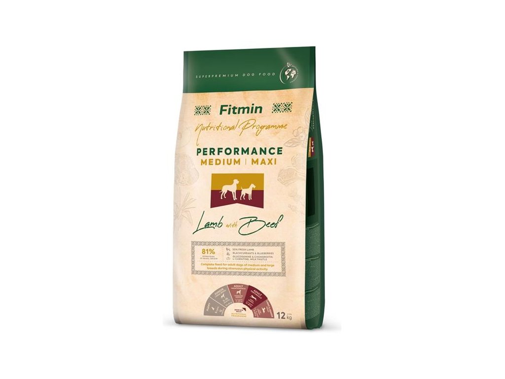 Superprémiové kompletní krmivo Performance Medium Maxi Lamb with Beef obsahuje vysoké procento jehněčího a hovězího masa v kombinaci s rýží a hrachem. Granule jsou speciálně uzpůsobené pro dospělé psy středních a velkých plemen (s hmotností od 15 kg) ve věku 1–7 let ve vysoké nebo sportovní zátěži. Z důvodu snížení rizika alergických reakcí receptura neobsahuje drůbeží maso, kukuřici ani pšenici. Krmivo je obohaceno borůvkami a černým rybízem pro jejich antioxidační účinky, prebiotiky a kloubní výživou. L-karnitin pomáhá chránit srdeční sval a ostropestřec mariánský působí pozitivně na funkci jater.