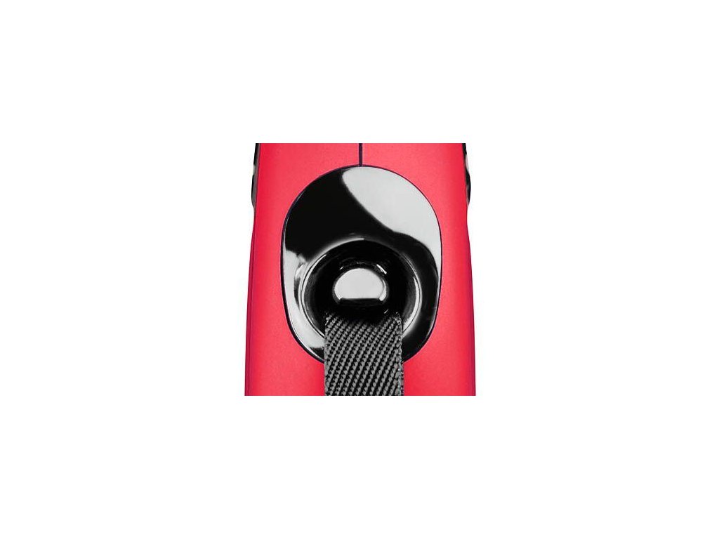 - Trvalá brzda: Stisknutím tlačítka brzdy a zasunutím pojistky palcem dopředu (jednoduchým pohybem palce zpět můžete trvalou brzdu kdykoli odblokovat), švihnutím paží ve směru psa se vodítko automaticky navine, stisknutím tlačítka brzdy palcem pak psa přitáhnete k sobě.