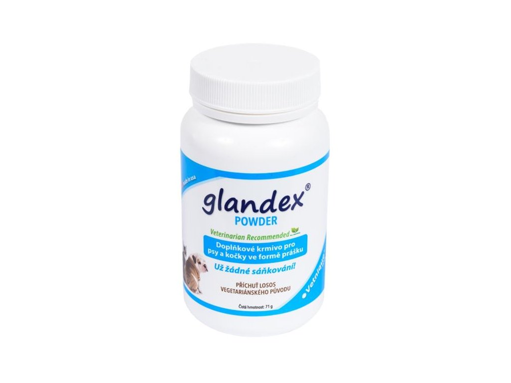 Doplňkové krmivo pro psy a kočky ve formě chutného prášku (lososová příchuť) postupně snižuje frekvenci nutnosti vymačkávání análních žlázek. Díky obsahu vlákniny působí na trávení a formuje stolici. Obsahuje enzymy, protizánětlivé látky a probiotické kultury E. faecium, které podporují správnou funkci trávicího traktu. Glandex je vhodnou prevencí proti zánětům análních žlázek a má hojivé účinky při již probíhajících zánětech. Dále potlačuje skryté infekce a alergie, ovlivňuje množství a konzistenci análního sekretu a pomáhá rozřeďovat sekret u tuhých pastovitých konzistencí. Je bezpečný i při dlouhodobém užívání (obsahuje přírodní složky).