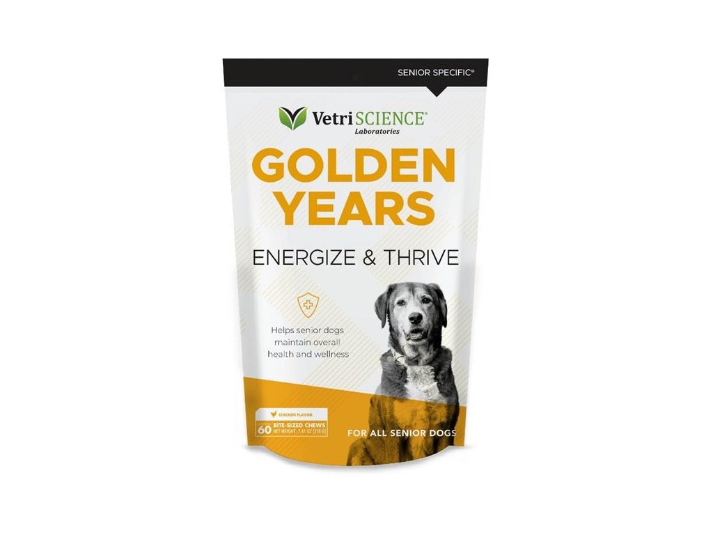 GOLDEN YEARS Energize & Thrive je komplexní multivitamin, s více než 25 veterináři doporučovanými živinami, který uspokojí nutriční potřeby seniorních psů. Energize & Thrive, speciálně navržený pro starší psy, pomáhá čelit účinkům stárnutí kombinací aminokyselin, vitamínů skupiny B, minerálů a omega mastných kyselin. Tato receptura specifická pro seniory podporuje imunitní a trávicí funkce, zdravou pokožku a srst, funkci srdce a nervů a celkovou pohodu. Taurin je obsažen pro podporu správné funkce kardiovaskulárního systému. Pamlsky s příchutí kuřecích jater jsou bez obsahu zrnin, snadno se rozdělí na kousky a jsou vhodné pro psy s citlivým zažíváním.