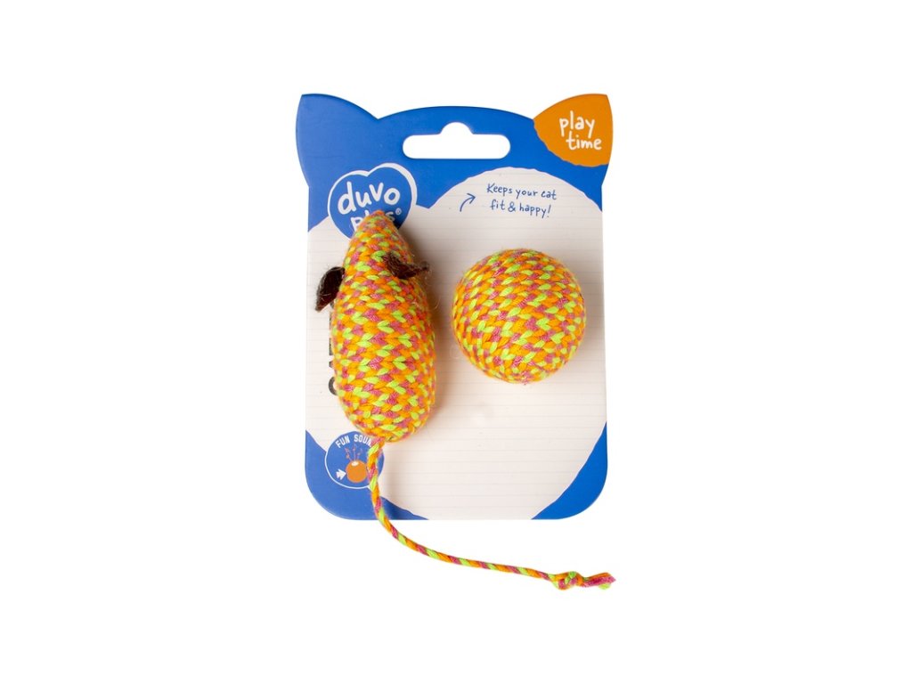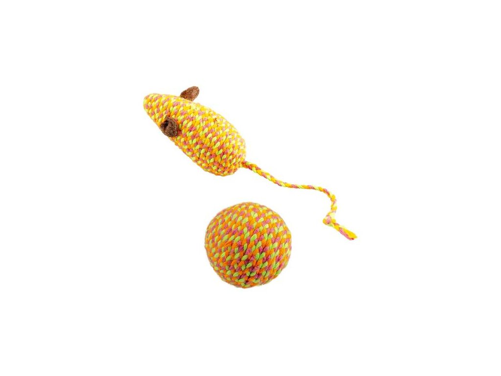 Barevná myš a míček pro kočky jsou omotané bavlněným provázkem. Uvnitř míčku i myši je ukrytá rolnička, která při pohybu cinká a vybízí ke hře. Hračka podporuje přirozený lovecký instinkt a motivuje kočku k pohybu, čímž ji pomáhá udržet v kondici.