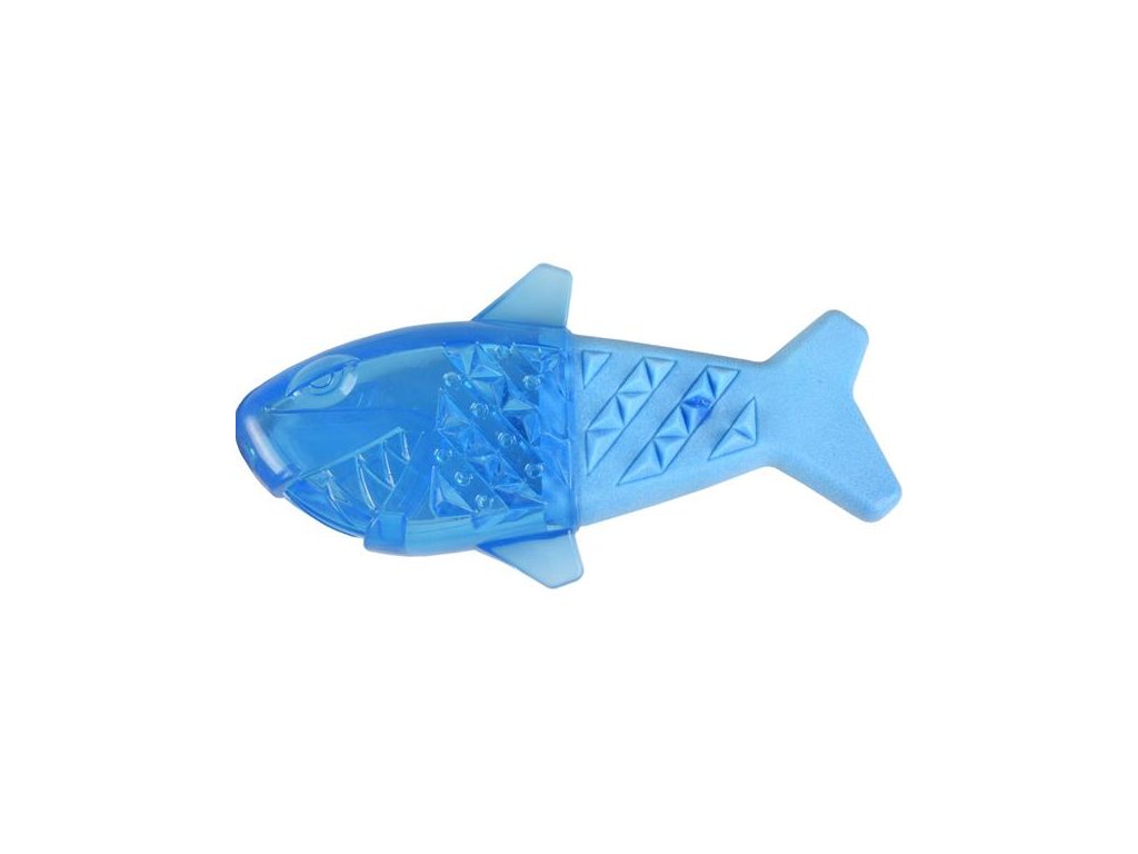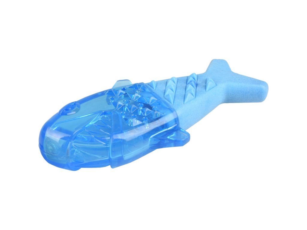 Ryba Flamingo Snowy z odolné termoplastické gumy je ideální hračkou pro ochlazení psa v horkých letních dnech. Stačí ji naplnit vodou a zmrazit. Výstupky na povrchu hračky masírují dásně a čistí chrup, čímž napomáhají přirozené péči o zuby.