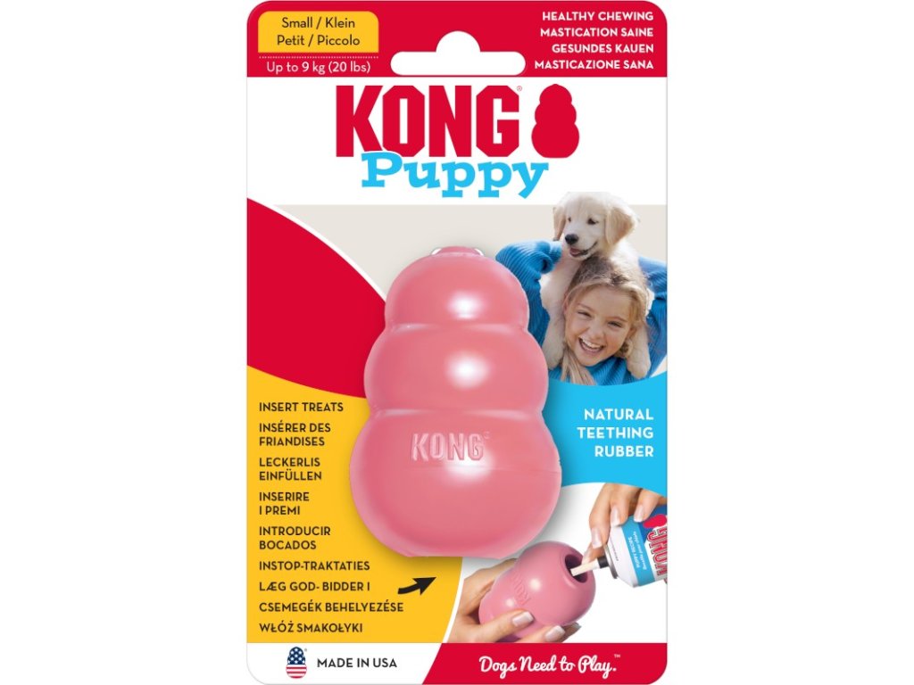 KONG Puppy je interaktivní plnitelná hračka pro štěňata ze speciální odolné gumy. Je výborná zejména pro štěňátka do věku 9 měsíců, její předností je daleko větší odolnost než u jiných běžně dostupných hraček. Je vyrobena z ultra elastického, čistě přírodního kaučuku, který je velmi pružný a zároveň velmi odolný a pevný i pro největší ničitele hraček. Speciální tvar zajišťuje při dopadu nepravidelný odraz. Hračku lze naplnit pamlsky nebo pastou a zvýšit tak zájem psa o hračku.