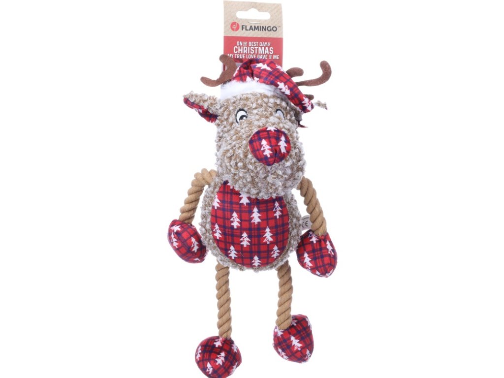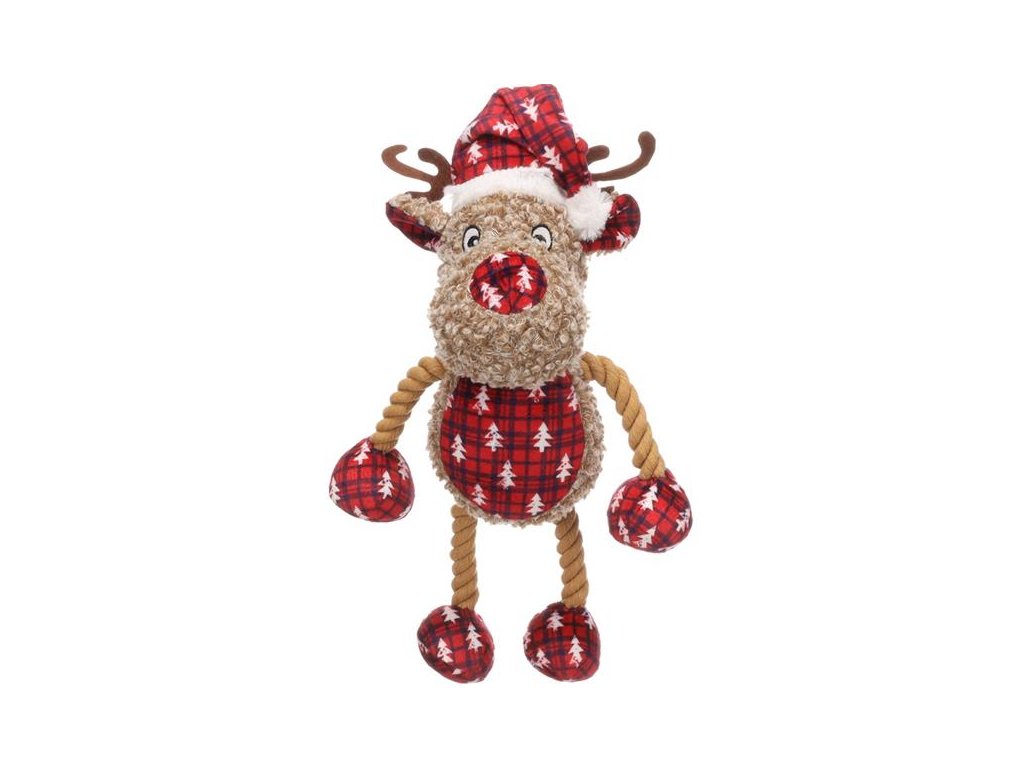 Hračka pro psy ve tvaru soba s vánoční čepičkou je vyrobena z měkkého plyše a má provázkové končetiny. Pro větší potěšení ze hry obsahuje sob pískátko.