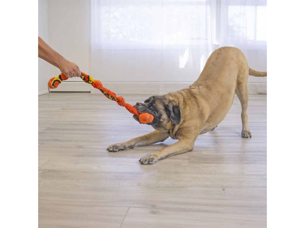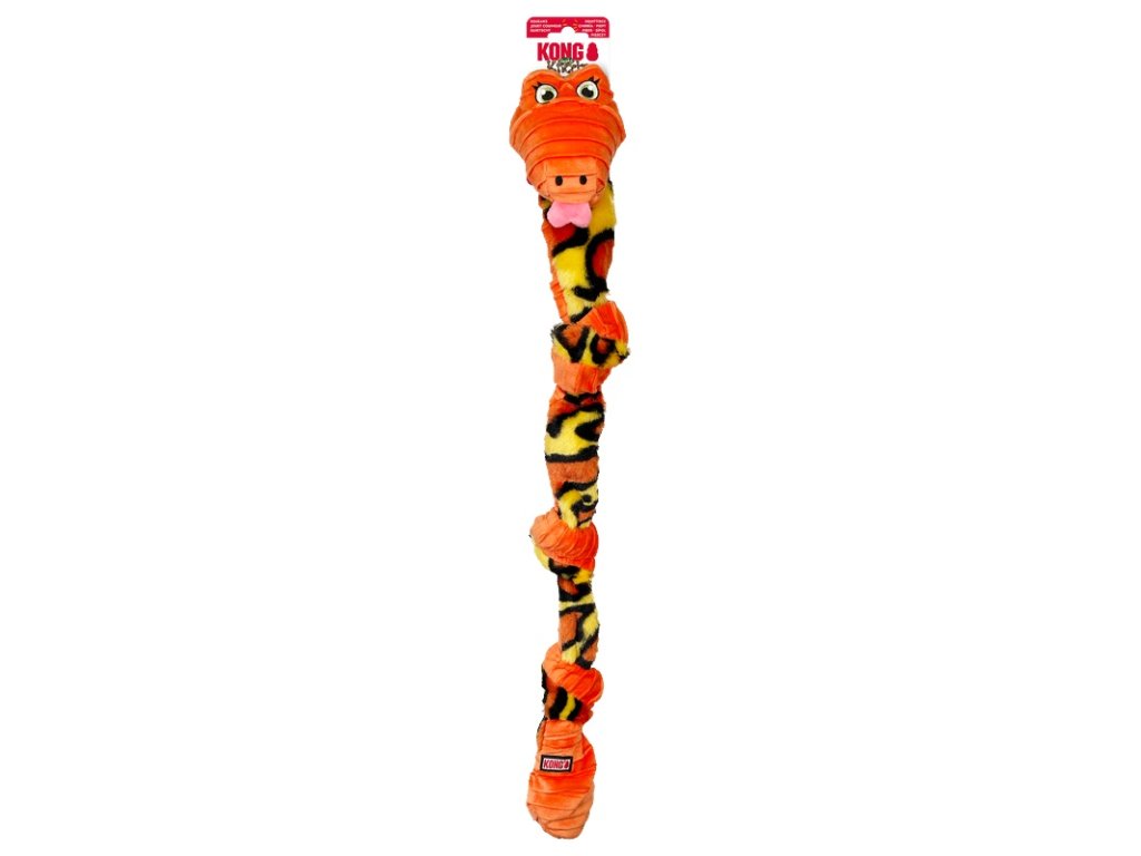 Hračka KONG Knots Snake je na povrchu měkká, ale uvnitř ukrývá pevnou provazovou kostru, která zvyšuje její odolnost a uspokojuje přirozený kousací instinkt psa. Díky dlouhému plandavému tělu je ideální pro lomcování, přetahování i aportování. Zabudovaná pískátka udržují pozornost psa a prodlužují hru. Had je dostatečně štíhlý, aby si s ním mohli hrát psi všech velikostí – perfektní parťák pro samostatnou i společnou zábavu.