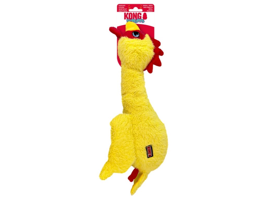 Hračka KONG Scruffs Chicken pro psy je skvělým parťákem pro chvíle zábavy i odpočinku. Plyšová slepice má dlouhý krk s jedinečně tvarovaným „superpískátkem“, který psa motivuje ke kousání, lomcování i aportování. Měkké plyšové tělo je ideální na mazlení, zatímco prodloužený krk se skvěle drží v tlamě – perfektní pro psy, kteří rádi nosí své hračky všude s sebou.