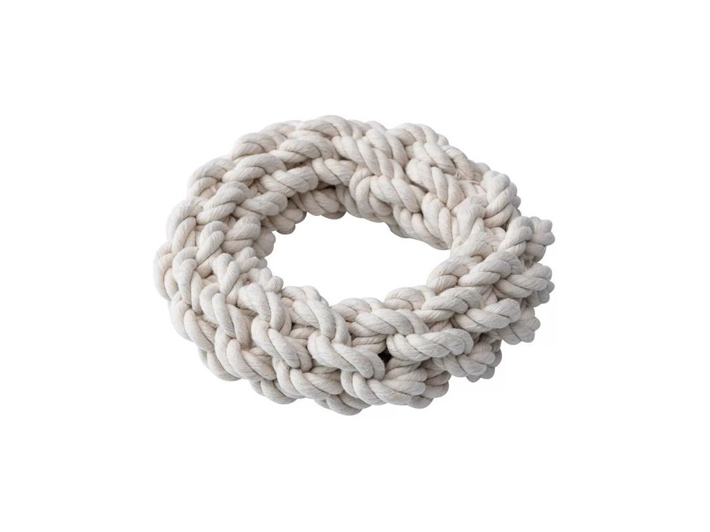 Bavlněné přetahovadlo pro psy ve tvaru kruhu je spletené z pevných přírodních provázků. Hodí se na přetahování, aportování i kousání. Během hry přirozeně čistí chrup a přispívá ke zdraví zubů a dásní.