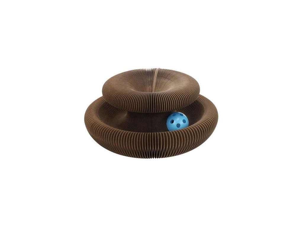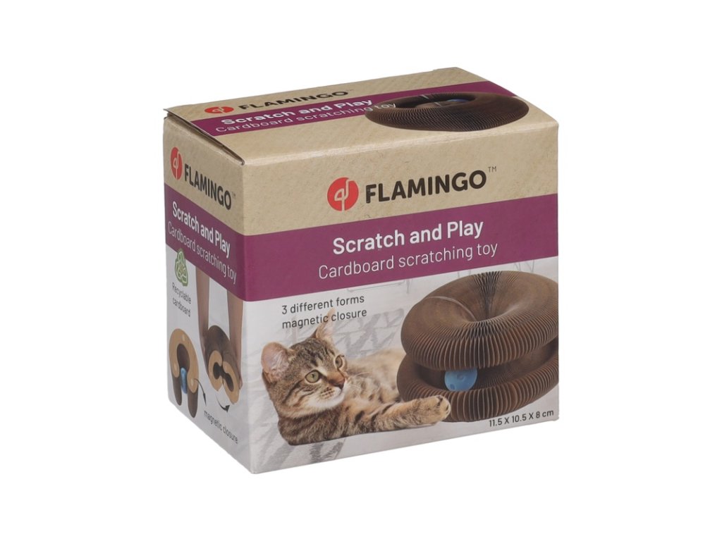 Skládací papírové škrabadlo Flamingo Kava pro kočky je vyrobeno z kvalitního recyklovatelného vlnitého kartonu. Díky vynalézavé konstrukci a magnetickému zapínání lze snadno rozložit do tří různých tvarů. Složené zabírá jen málo místa, takže je ideální i jako cestovní škrabadlo. Součástí balení je cinkající kulička a sáček s catnipem (šantou kočičí), kterým lze škrabadlo posypat, aby bylo pro kočku ještě přitažlivější.