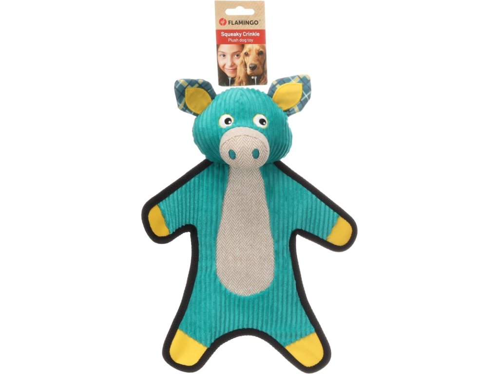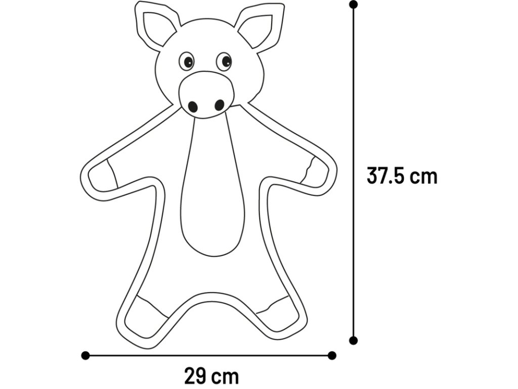 Textilní hračka pro psy ve tvaru prasátka vyrobená z plyše a manšestru má zesílené lemování pro větší odolnost. Pro ještě větší potěšení ze hry prase píská a šustí.