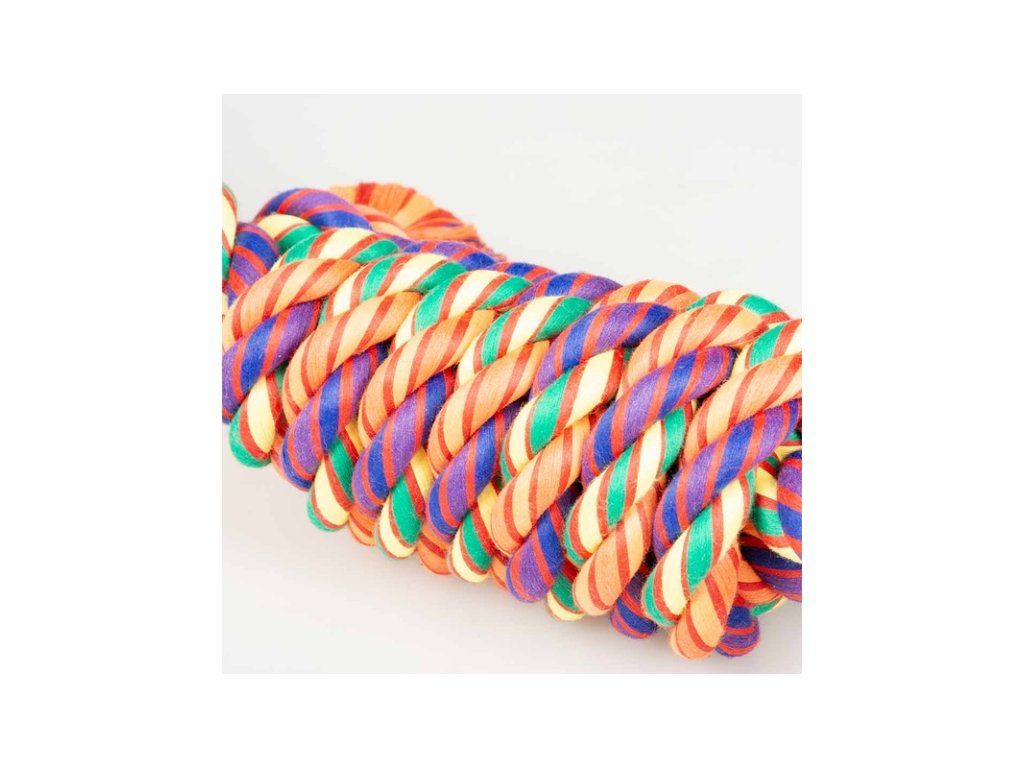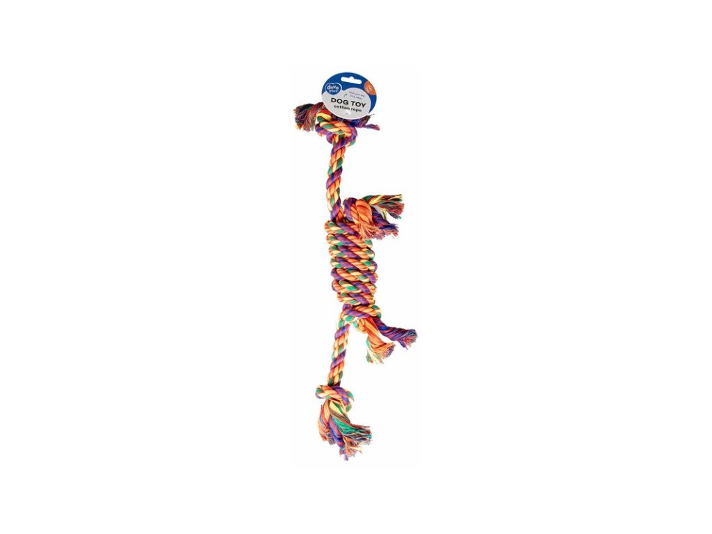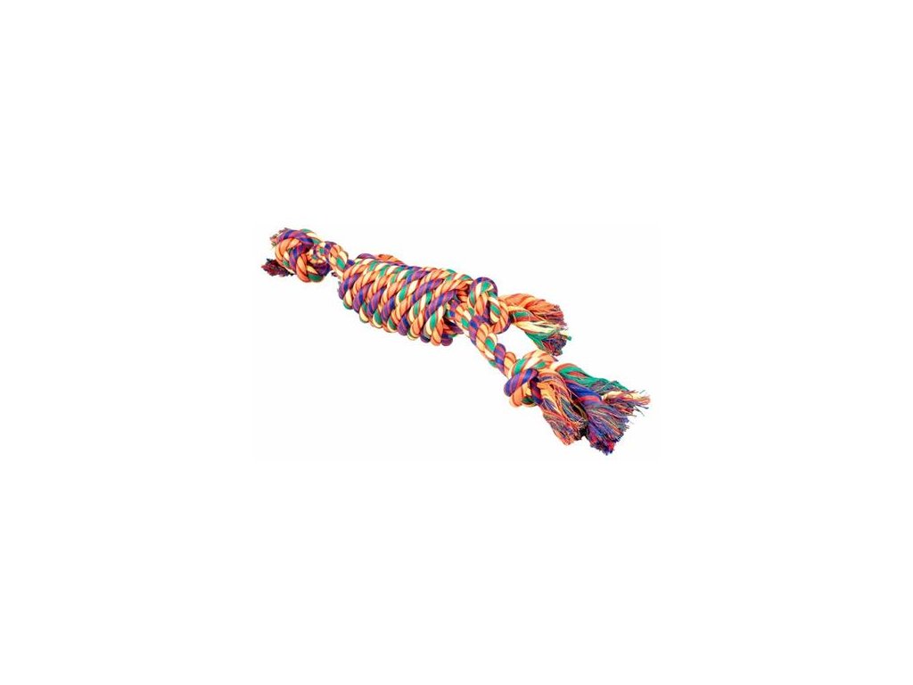 Odolné bavlněné přetahovadlo pro psy je spletené z pevných barevných provázků a má uzly pro lepší úchop při hře. Hodí se pro přetahování, aportování i kousání. Bavlněné provázky během hry přirozeně čistí chrup a přispívají tak ke zdraví zubů a dásní.