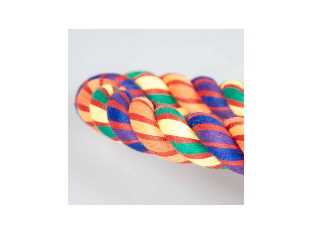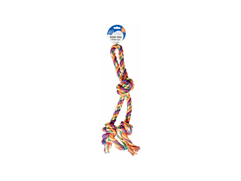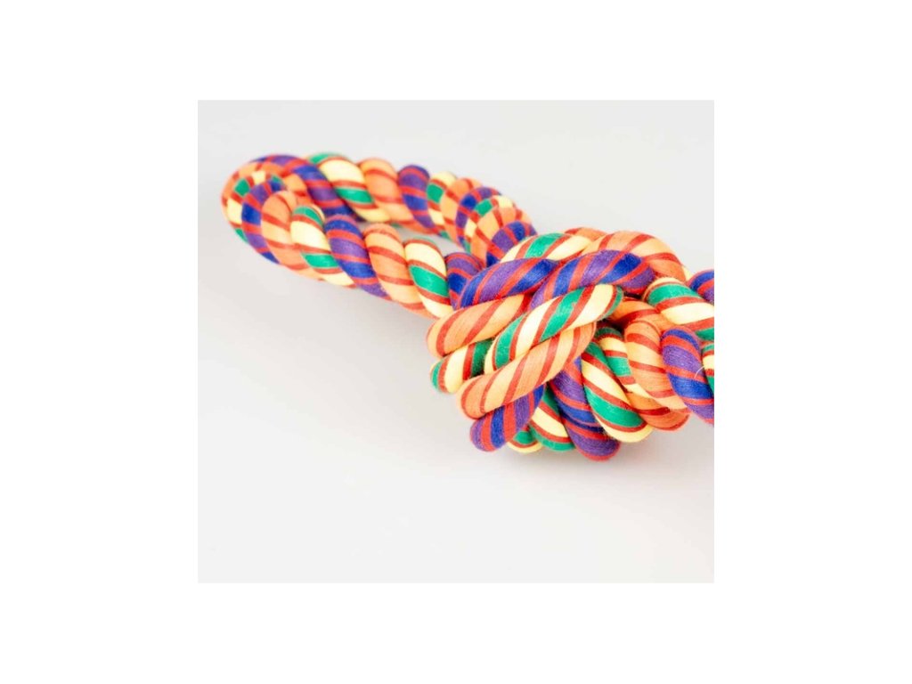 Odolné bavlněné přetahovadlo pro psy je spletené z pevných barevných provázků s uzly a na jedné straně je zakončené okem pro snadné uchopení. Hodí se pro přetahování, aportování i kousání. Bavlněné provázky během hry přirozeně čistí chrup a přispívají tak ke zdraví zubů a dásní.