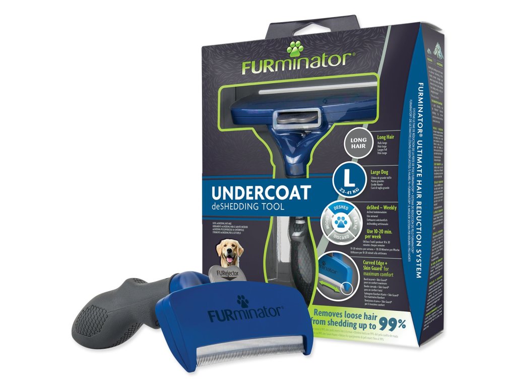 FURminator® hrablo k vyčesávání podsady pro psy velkých o hmotnosti do 24-41 kg s dlouhou srstí. Odstraňuje až 99 % uvolněných chlupů.