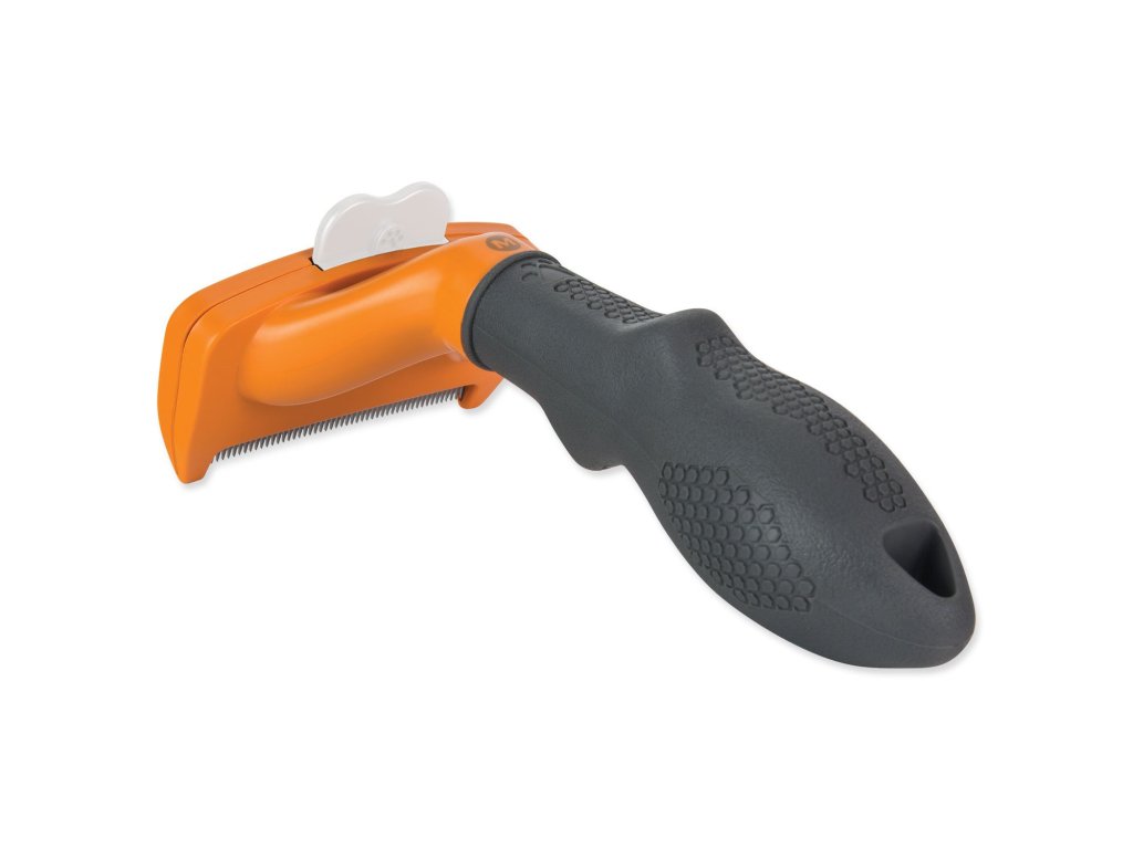 - Vyčesávací hrana z nerezové oceli proniká hluboko do srsti zvířete, kde šetrně a lehce odstraňuje uvolněné chlupy z podsady, aniž by poranila kůži nebo poškodila srst.