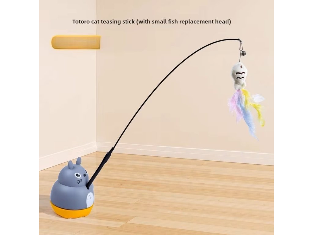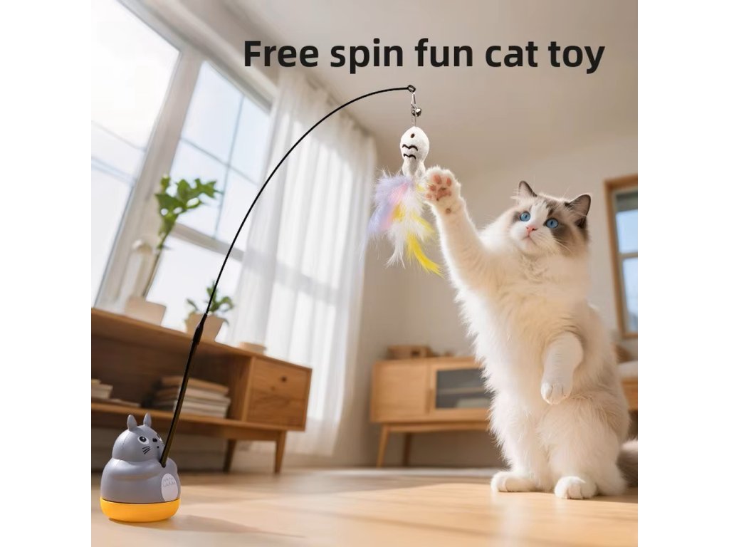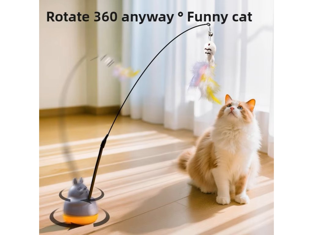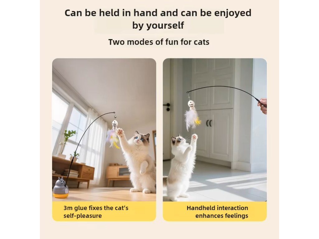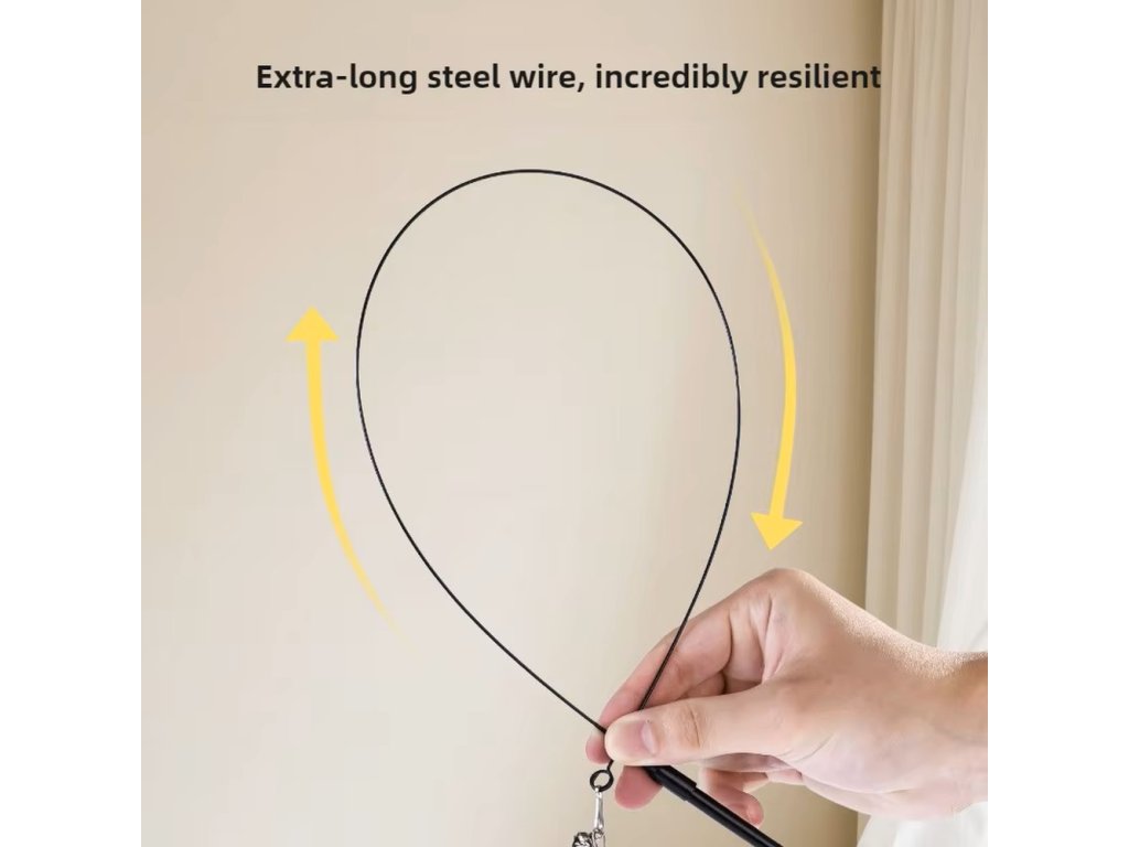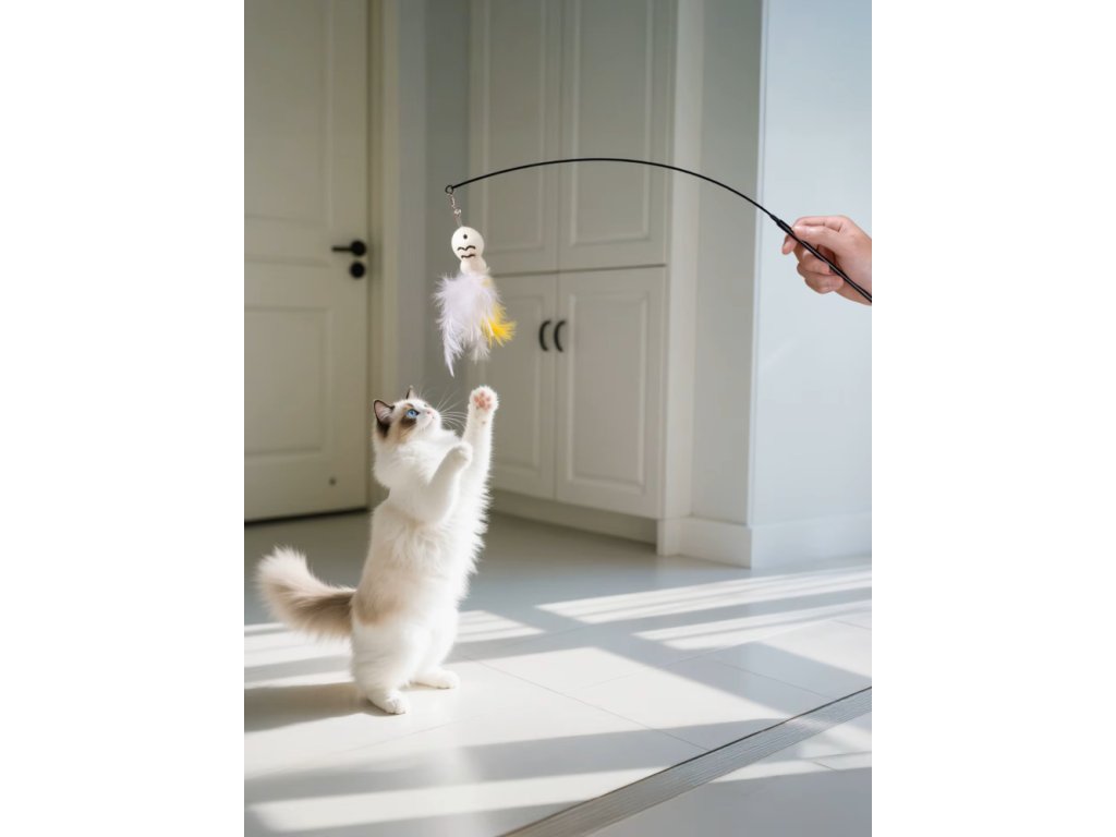 Hlavní část tvoří pružná ocelová tyč, která se při pohybu ohýbá a vrací zpět do původní polohy. Na jejím konci je plyšová hračka s barevnými pírky a rolničkou, která při pohybu jemně cinká 🔔. Kombinace pohybu, barev a zvuku napodobuje pohyb malé kořisti a probouzí u kočky přirozený instinkt lovce.