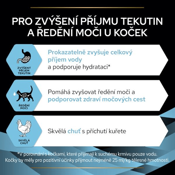 Speciální tekutá receptura s lahodnou kuřecí chutí pomáhá ředit moč a tím podporuje zdraví močových cest. Vhodné zejména pro kočky, které málo pijí, nebo u nichž chcete podpořit správnou funkci močového aparátu.