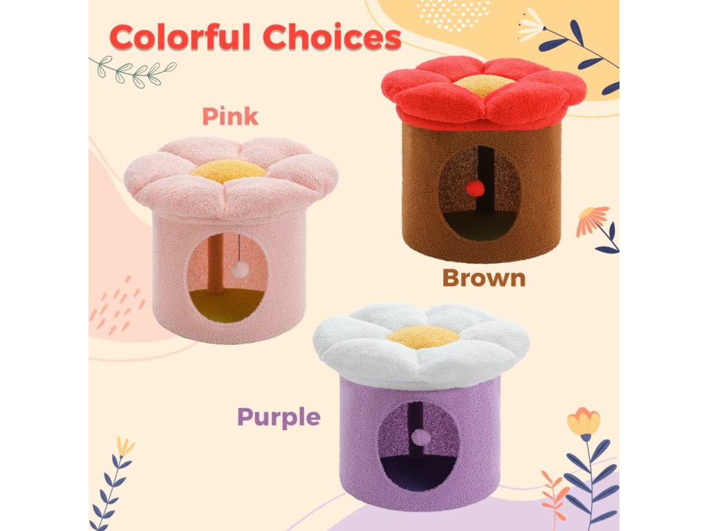 Tento roztomilý kočičí domeček nabízí kočkám útulné místo k odpočinku i zábavě. Velký odnímatelný pelíšek ve tvaru květu umožňuje snadné čištění a poskytuje dostatek prostoru i pro více koček. Stabilní konstrukce kombinuje domeček pro nerušené schování a horní měkkou plošinu, ze které může kočka pozorovat okolí nebo odpočívat. Pelíšek je vyroben z kvalitních materiálů a díky měkkému povrchu slouží zároveň jako pohodlné sedátko. Součástí je i hrací závěsná koule, která kočku zabaví. Vybírejte ze tří barev - fialové, růžové nebo hnědé.