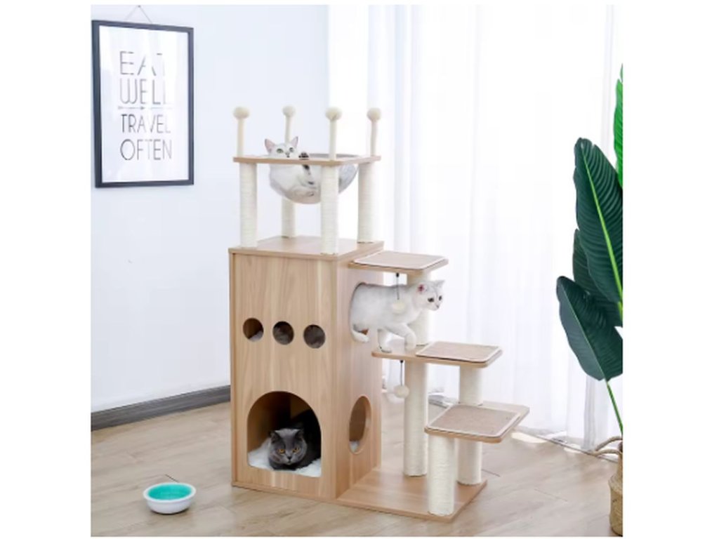 Moderní kočičí strom pro velké kočky ve velmi elegantním designu s vysokou odolností. Díky dřevěnému provedení působí stylově a neruší vzhled interiéru. Je navržený tak, aby poskytoval maximum prostoru pro hraní, odpočinek i škrábání. Stabilní základna zajišťuje bezpečný pohyb i velkým kočkám.