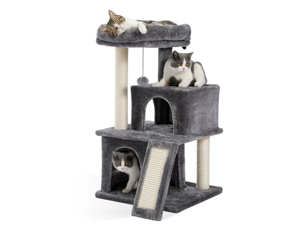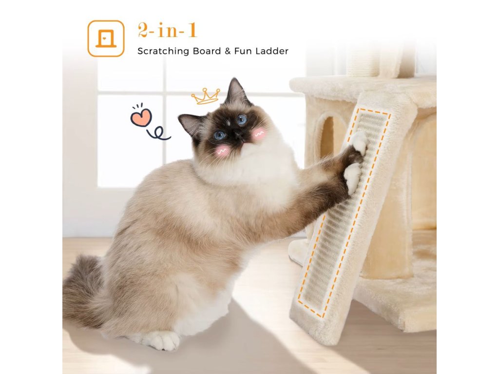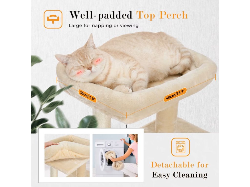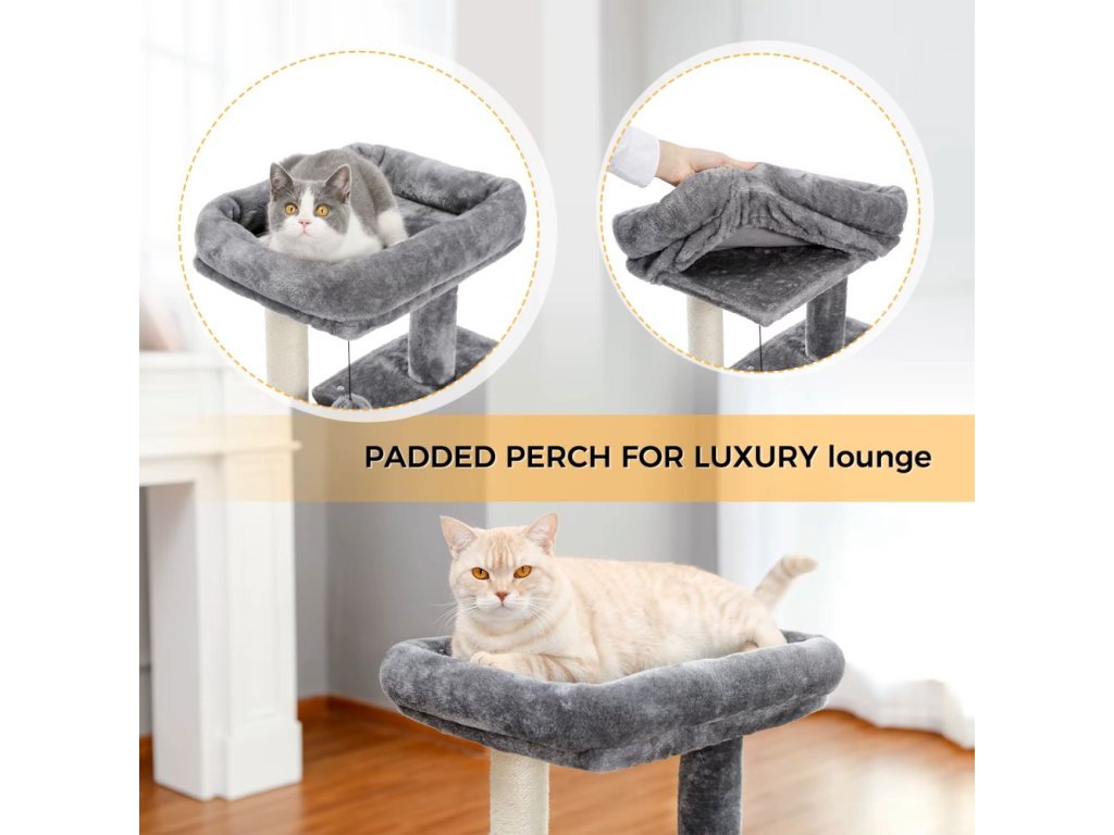 Třípatrová věž pro kočky se škrabadlem je luxusní centrum her, odpočinku i spánku pro vašeho chlupatého kamaráda. Nabízí dva prostorné domečky, pohodlné horní bidýlko a škrabadla z přírodního sisalu. Díky promyšlenému designu je vhodná jak pro mladé, tak i starší kočky – nižší patro je snadno přístupné, zatímco horní část uspokojí kočky milující skákání a lezení. Silná základna zajistí stabilitu i při aktivním hraní. Měkké plyšové potahy dodávají celé věži nádech luxusu a pohodlí. Ideální řešení pro více koček nebo větší plemena.