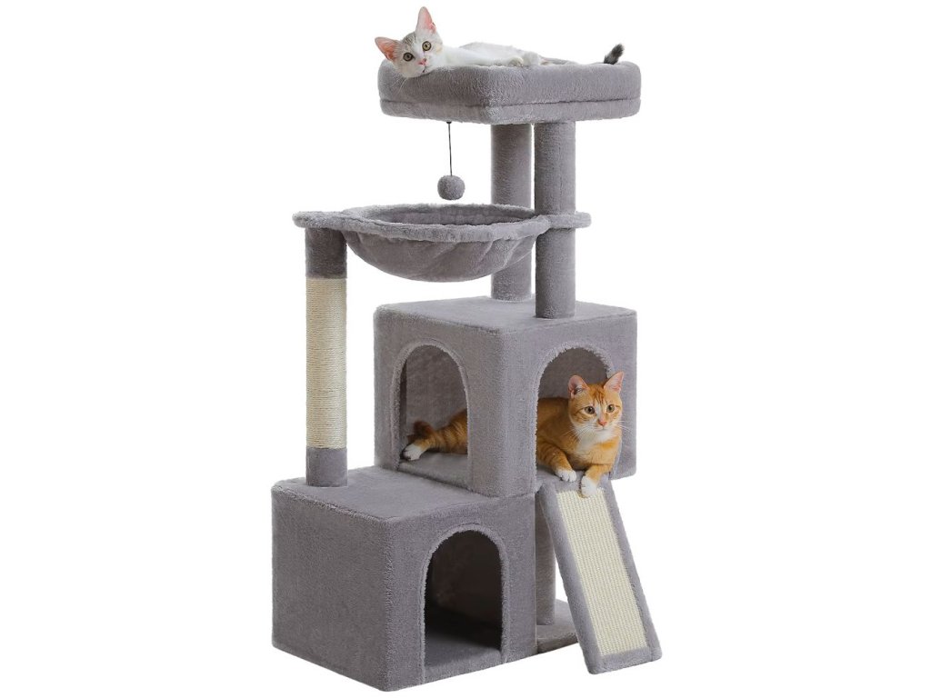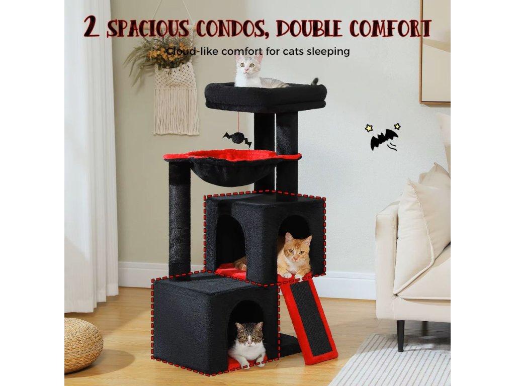 Vícepatrová věž pro kočky se škrabadlem je luxusní centrum her, odpočinku i spánku pro vašeho chlupatého kamaráda. Nabízí dva prostorné domečky, měkkou houpací síť, pohodlné horní bidýlko a škrabadla z přírodního sisalu. Díky promyšlenému designu je vhodná jak pro mladé, tak i starší kočky – nižší patro je snadno přístupné, zatímco horní část uspokojí kočky milující skákání a lezení. Silná základna a bezpečnostní popruh zajišťují stabilitu i při aktivním hraní. Měkké plyšové potahy dodávají celé věži nádech luxusu a pohodlí. Ideální řešení pro více koček nebo větší plemena.