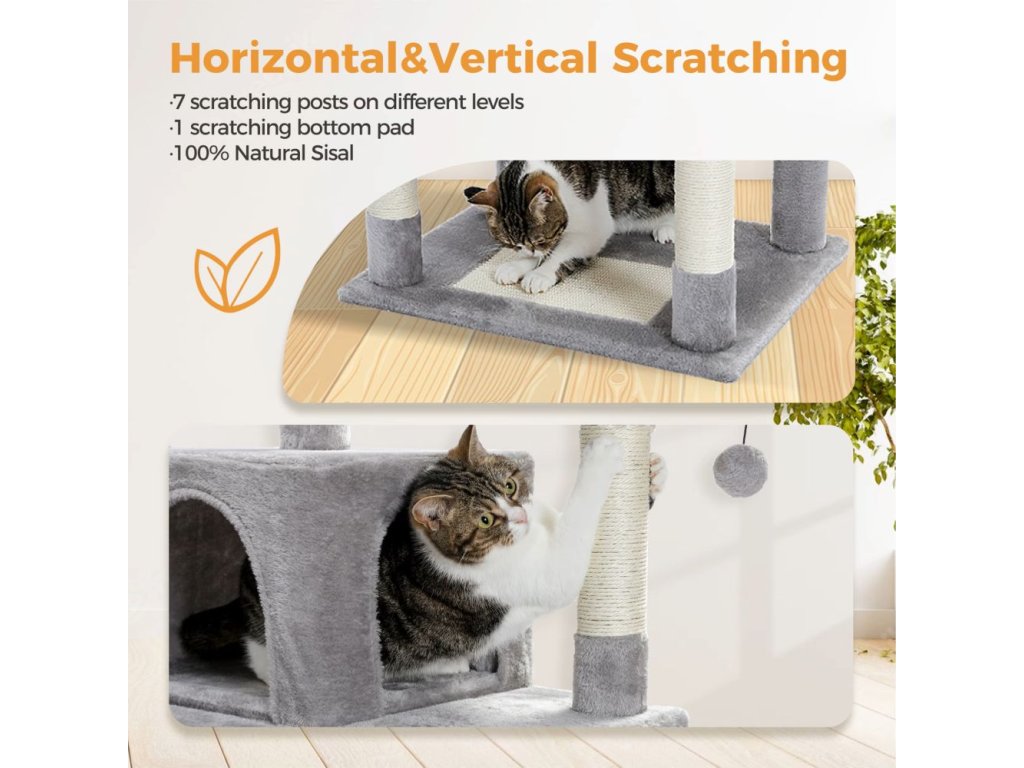 😺 Nekonečná zábava při lezení: 8úrovňová konstrukce poskytuje dostatek prostoru pro šplhání, hraní i odpočinek. Velký obdélníkový kočičí domeček a široká houpací síť jsou ideální pro pohodlný spánek i společné odpočívání.