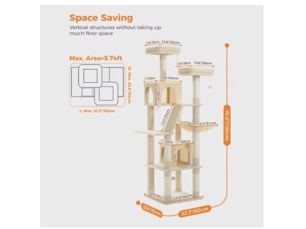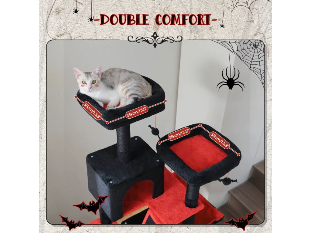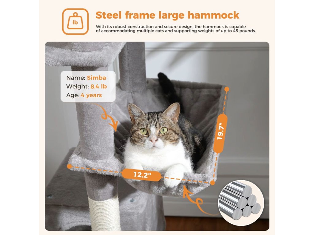 🐈⬛ Ideální pro více koček: pojme až 4–6 malých a středních koček zároveň. Dvě extra velká horní bidýlka a nadýchaná houpací síť poskytují dostatek prostoru i pro robustnější kočičky.
