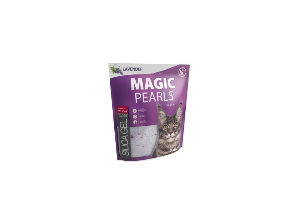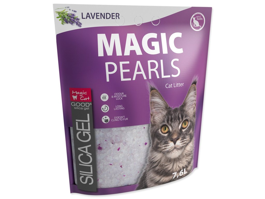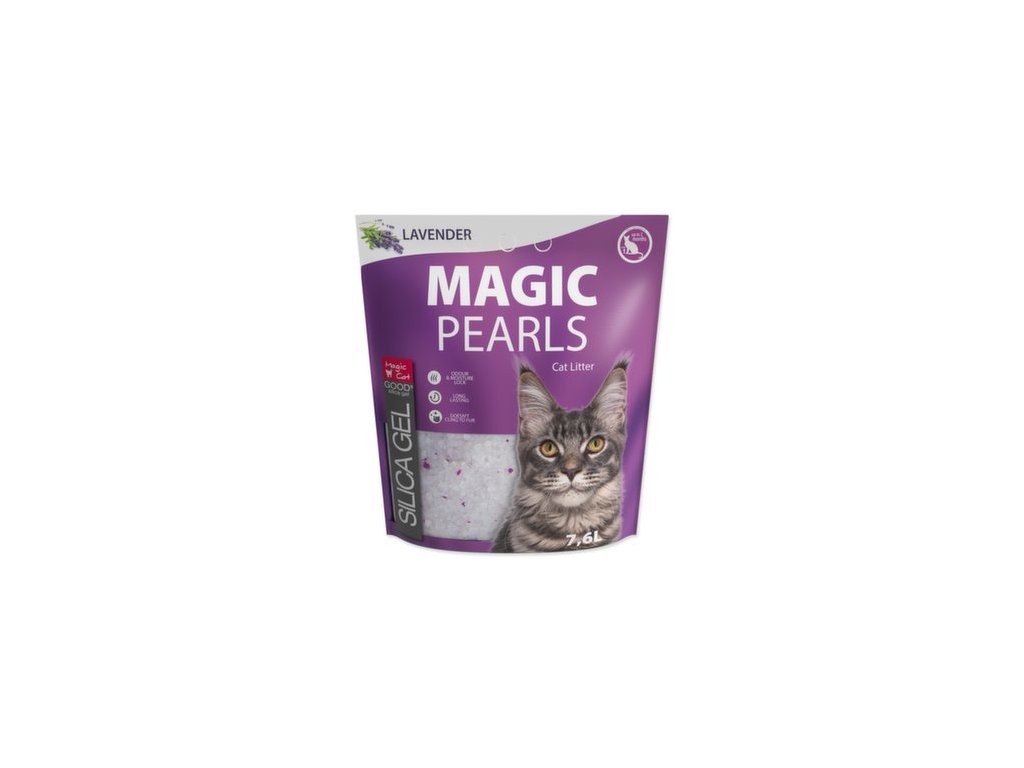 Silikátové stelivo pro kočky s jemnou vůní levandule. Díky mikropórům na sebe stelivo velice rychle váže tekutiny, které uzamkne uvnitř krystalků a eliminuje nepříjemný zápach. Tím zabraňuje množení nebezpečných bakterií. Díky tomuto inovativnímu procesu má stelivo Magic Pearls extrémní savost a udržuje toaletu suchou a čistou. Stelivo Magic Pearls je bezprašné a neulpívá na tlapkách a srsti zvířat, takže není kočkami vynášeno mimo toaletu. Stelivo je vhodné i pro dlouhosrstá plemena koček. Stelivo Magic Pearls v toaletě vydrží absorbovat pachy a vlhkost až 4 týdny (při použití jednou kočkou), proto je jeho použití také velice ekonomické, není třeba jej měnit tak často jako jiné druhy steliv.