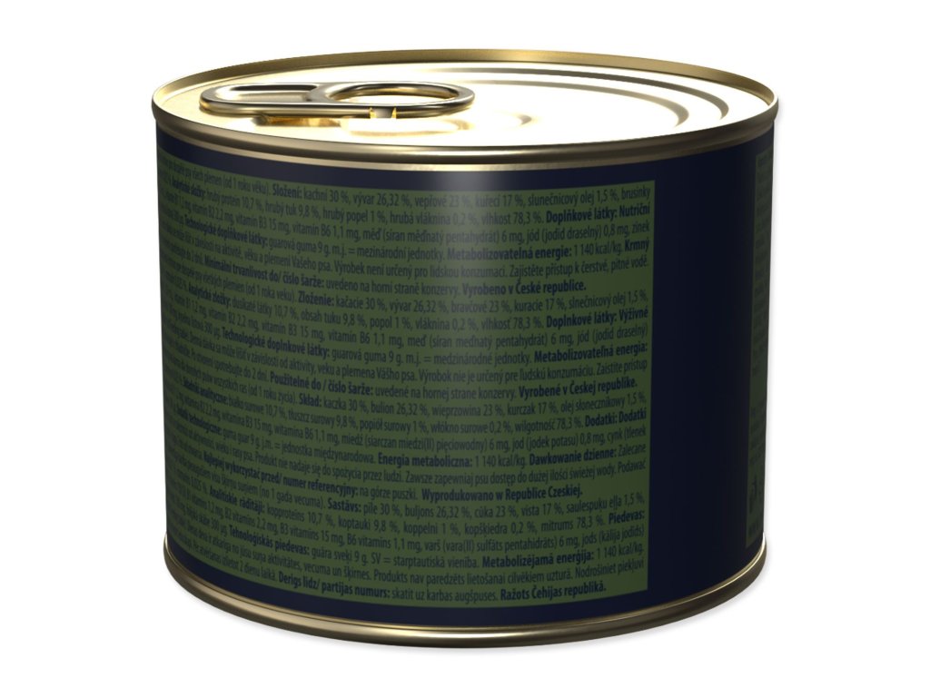 | Složení: | Kachní maso, Kuřecí maso, Lososový olej, Rozmarýn, Tymián, Vepřové maso, Vývar |