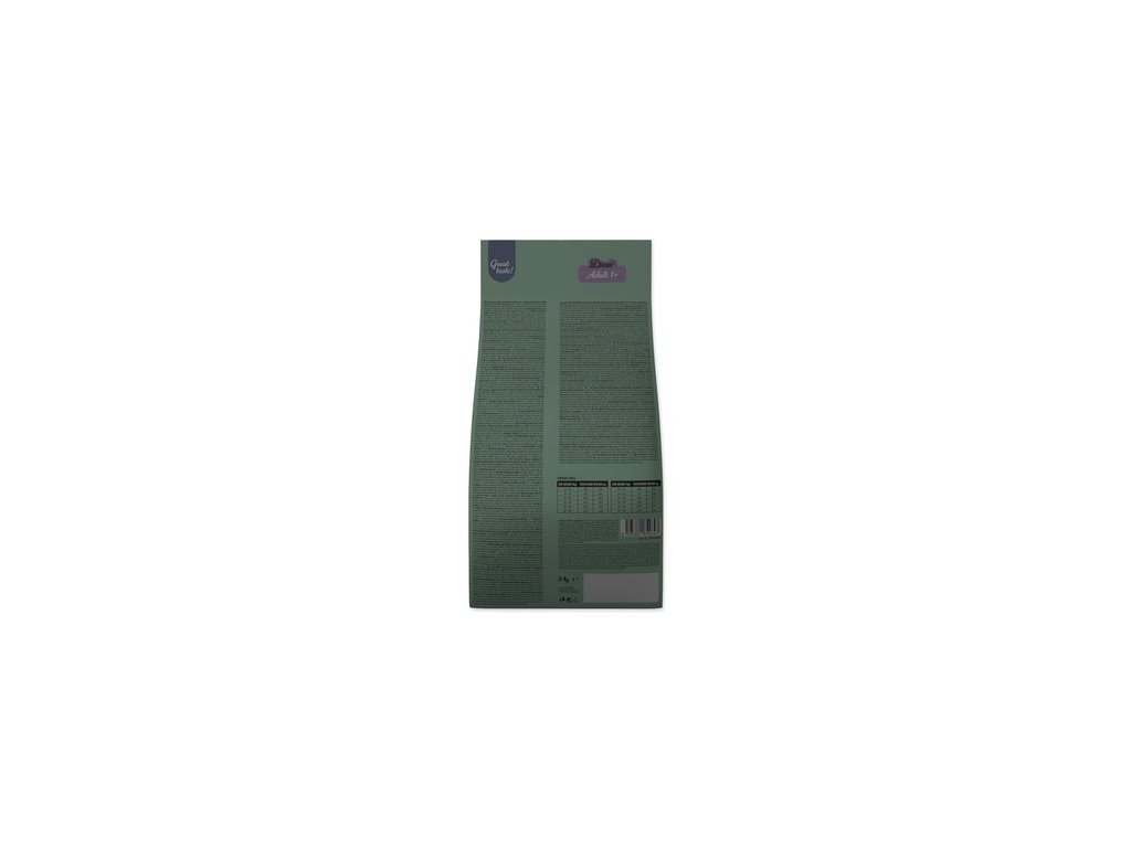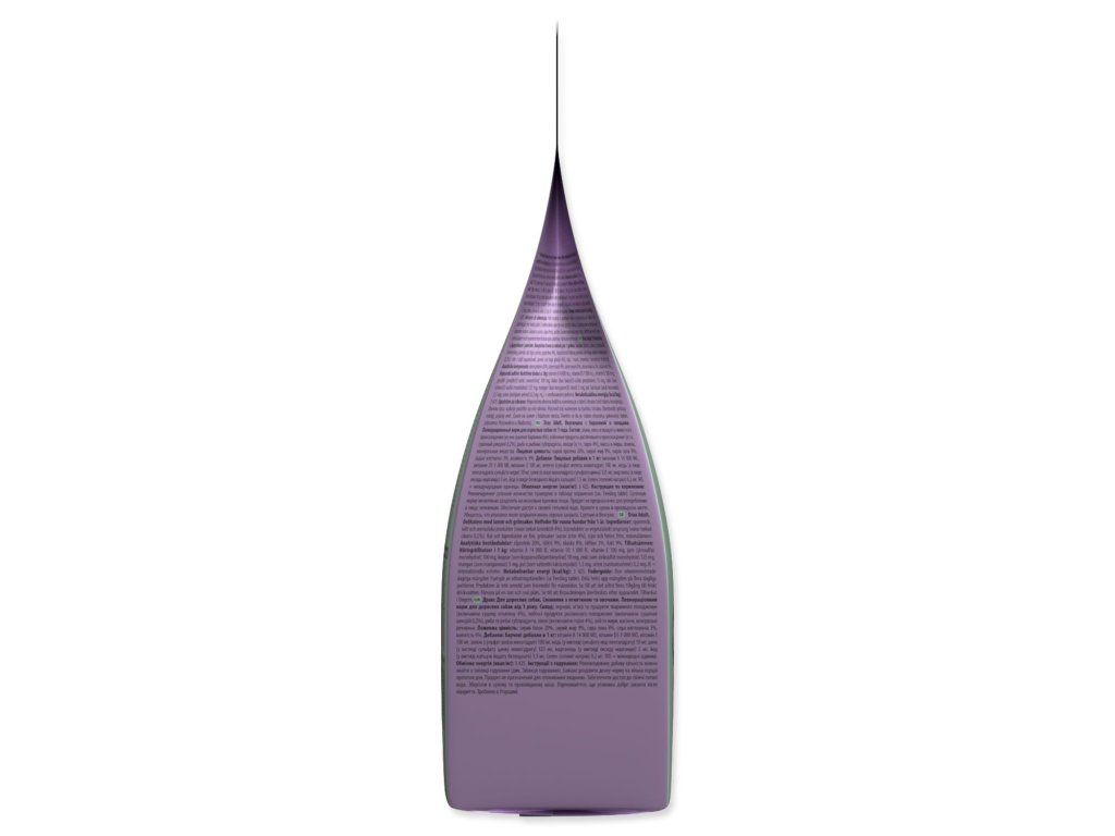 Složení: Obilniny, maso a výrobky živočišného původu (z toho sušené jehněčí 4 %), vedlejší výrobky rostlinného původu (z toho sušená čekanka 0,2 %), ryby a vedlejší výrobky z ryb, zelenina (z toho hrášek 4 %), oleje a tuky, semínka, minerální látky.