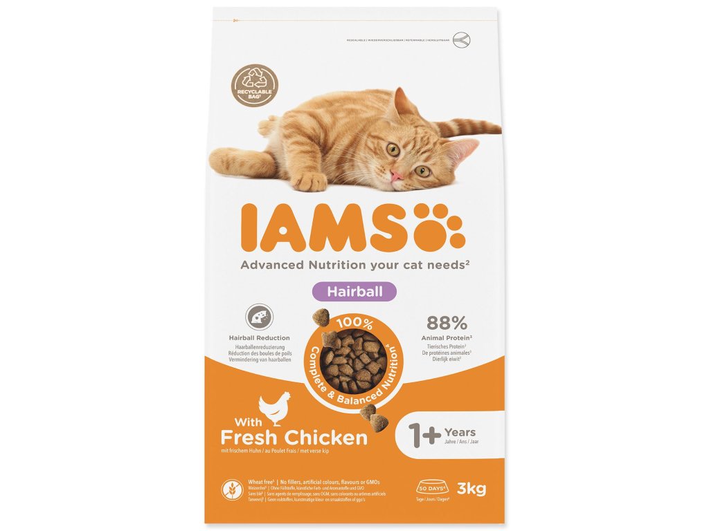 IAMS Cat Adult Herbcontrol (Hairball) Chicken 3 kg je kvalitní kompletní krmivo pro dospělé kočky, speciálně vyvinuté tak, aby pomáhalo předcházet tvorbě chlupových bezoárů (hairballů) a podporovalo zdravé trávení 🐱🍗. Už při prvním pohledu zaujme receptura s vysoce stravitelným kuřecím masem jako hlavní bílkovinou, která dodává potřebnou energii, vyváženým obsahem živin, vlákninou pro podporu průchodu chlupů trávicím traktem, a přizpůsobenou chutí, kterou většina koček miluje 😺🌾. Díky této kombinaci se krmivo hodí pro každodenní krmení dospělých koček s tendencí tvořit chlupové koule – podporuje zdravou pokožku, lesklou srst i celkové zažívání ✨.