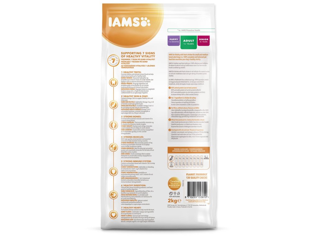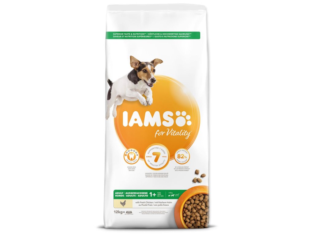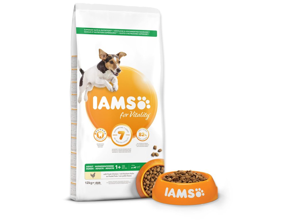 Krmivo IAMS for Vitality pro dospělé psy malých a středních plemen je 100% kompletní a vyvážené odborníky sestavené krmivo, které bude vašemu zvířeti chutnat a svědčit. Naše nová a vylepšená receptura pro dospělé psy s čerstvým kuřecím masem je založena na kvalitních živočišných bílkovinách, které byly pečlivě vybrány, aby podporovaly sedm znaků zdravé vitality psa. Aby byl váš pes zdravý, aktivní a plný energie, obsahují naše lahodné receptury až 82 % živočišných bílkovin (z celkového obsahu bílkovin).