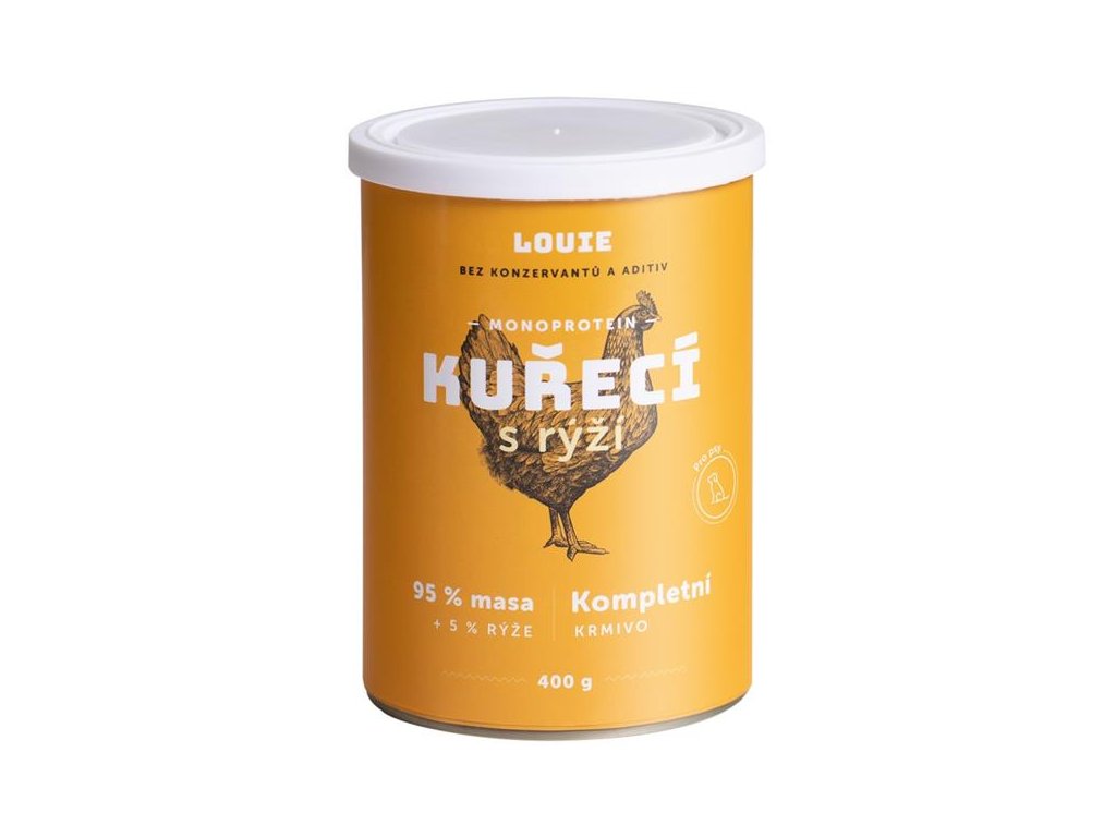 Masová konzerva pro psy Louie s obsahem 95% jemně namletého masa a s 5% rýže bez přidané želatiny, konzervantů, dochucovadel, barviv či stabilizátorů.