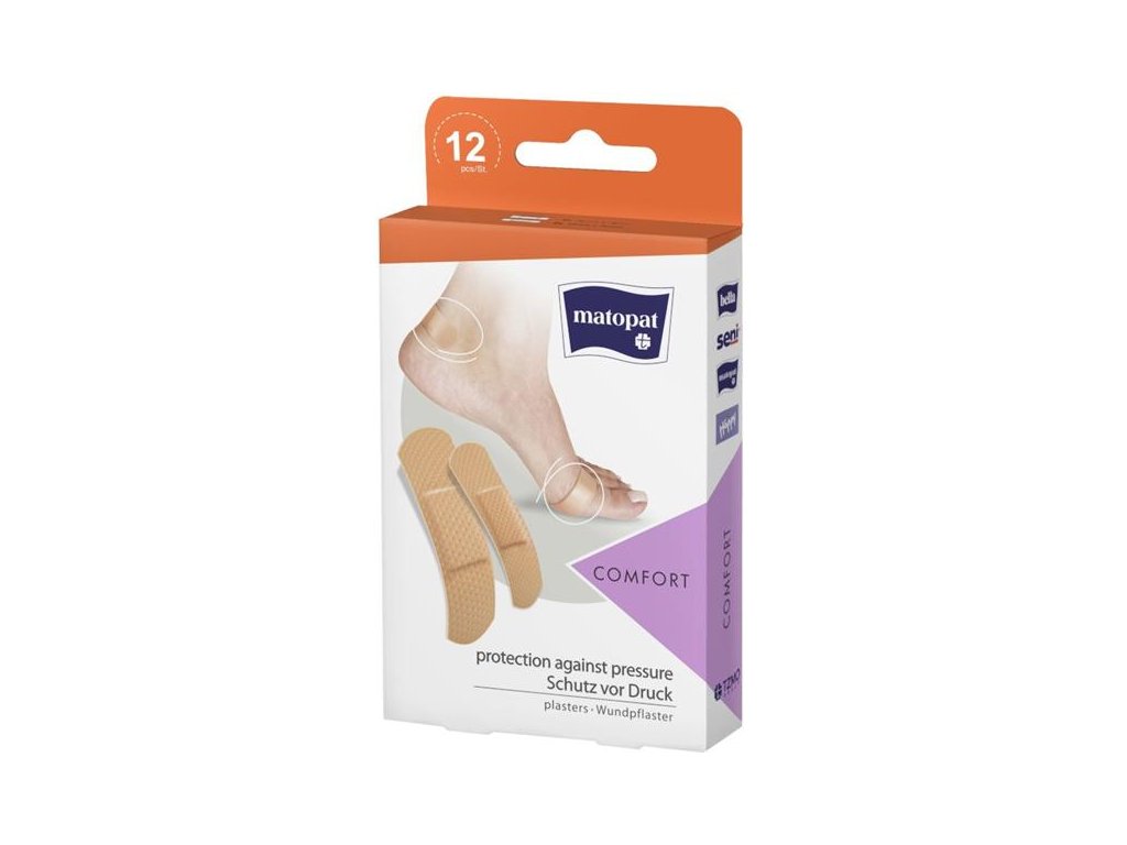 Sada pevných náplastí Comfort slouží k ochraně míst vystavených tlaku, k prevenci puchýřů a otlaků nebo ke zmírnění odřenin. Elastický, mikroskopicky pórovitý podklad eliminuje tření a tlak na exponovaná místa. Balení obsahuje 12 ks náplastí ve dvou velikostech. Hlavní přednosti: decentní tělová barva, elastický materiál s polštářkem, různé velikosti podle rozsahu poranění, ochrana před vodou a nečistotami. Použití: Před aplikací očistěte a osušte pokožku. Náplasti vyměňujte dle potřeby.