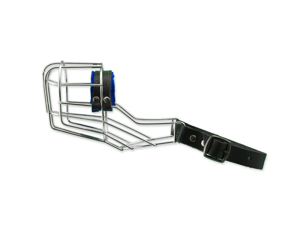 Kovový náhubek s koženými řemínky na zapínán. Vhodný například pro pudla.