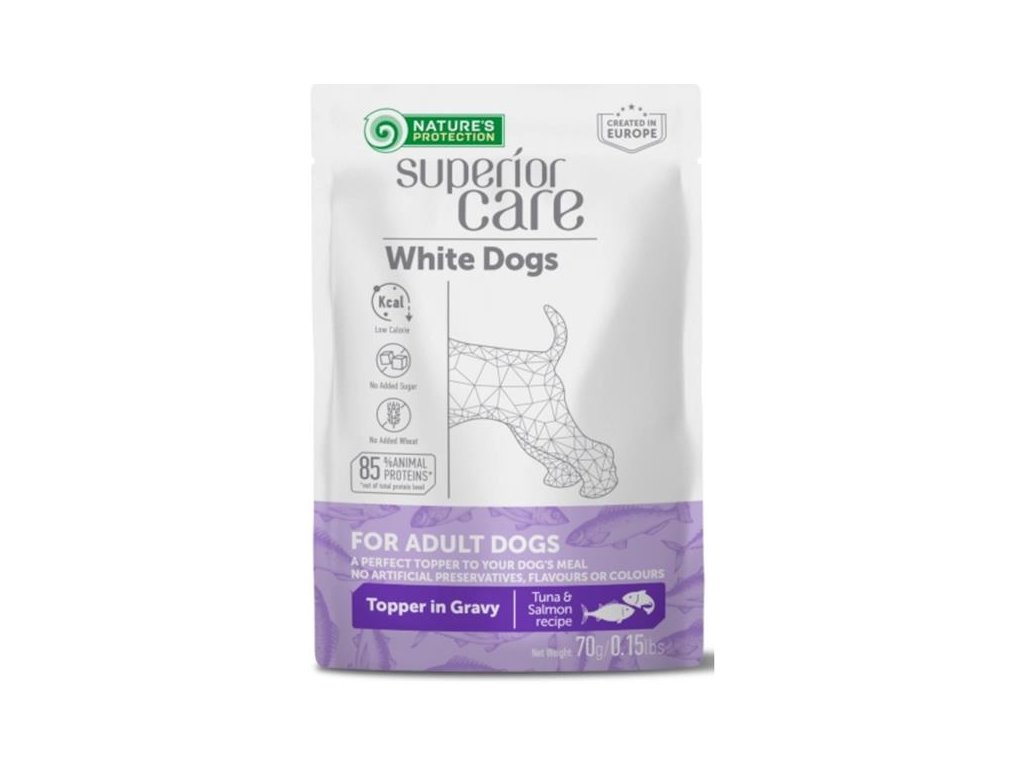 Doplňkové vlhké krmivo je vhodné pro dospělé psy s citlivým zažíváním a je speciálně určené pro psy s bílou nebo světlou srstí pro zvýraznění bílého pigmentu. Tuňák s lososem poskytují vysoce kvalitní bílkoviny a omega-3 mastné kyseliny, které napomáhají udržení svalové hmoty, dodávají lesk srsti a prospívají zdraví srdce. Kapsička může posloužit jako chutný a výživný topper (poleva) na granule pro zlepšení trávení, zvýšení hydratace a celkovou podporu zdraví.