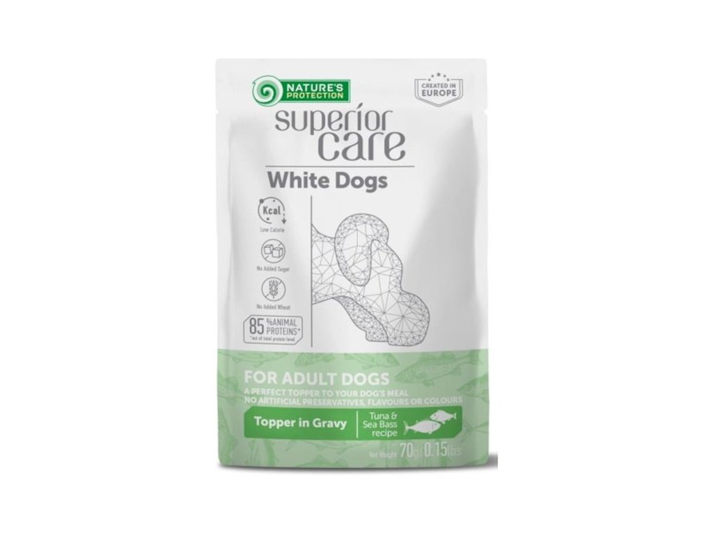Doplňkové vlhké krmivo je vhodné pro dospělé psy s citlivým zažíváním a je speciálně určené pro psy s bílou nebo světlou srstí pro zvýraznění bílého pigmentu. Tuňák s mořským vlkem poskytují vysoce kvalitní bílkoviny a omega-3 mastné kyseliny, které napomáhají udržení svalové hmoty, dodávají lesk srsti a prospívají zdraví srdce. Kapsička může posloužit jako chutný a výživný topper (poleva) na granule pro zlepšení trávení, zvýšení hydratace a celkovou podporu zdraví.