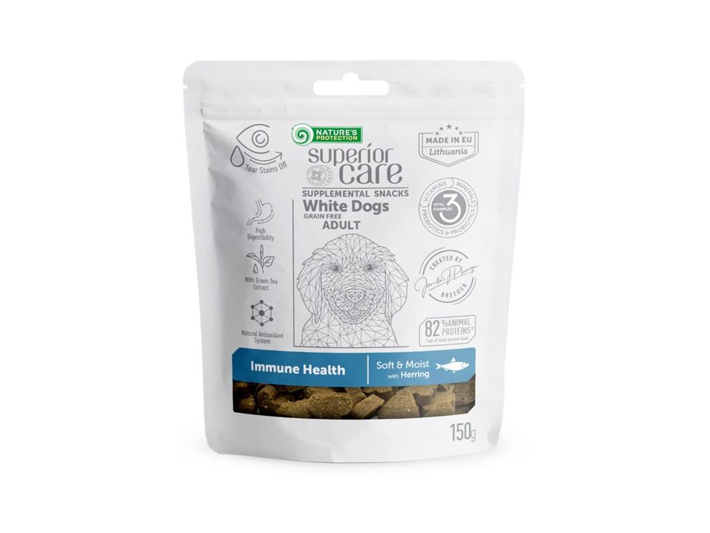 Nature’s Protection Superior Care White Dogs Adult Immune Health je prémiový doplněk stravy se sleděm vyvinutý speciálně pro dospělé psy všech plemen s bílou nebo světlou srstí pro podporu jejich imunitního systému. Jsou vhodné i pro psy, u nichž je třeba regulovat tělesnou hmotnost. Jsou grain-free – pamlsky neobsahují obiloviny, které by mohly způsobit alergické reakce. Mají vyvážené množství probiotik a prebiotik, díky čemuž přispívají k harmonizaci střevního prostředí, podporují zdravé střevní bakterie a napomáhají hladkému trávení.